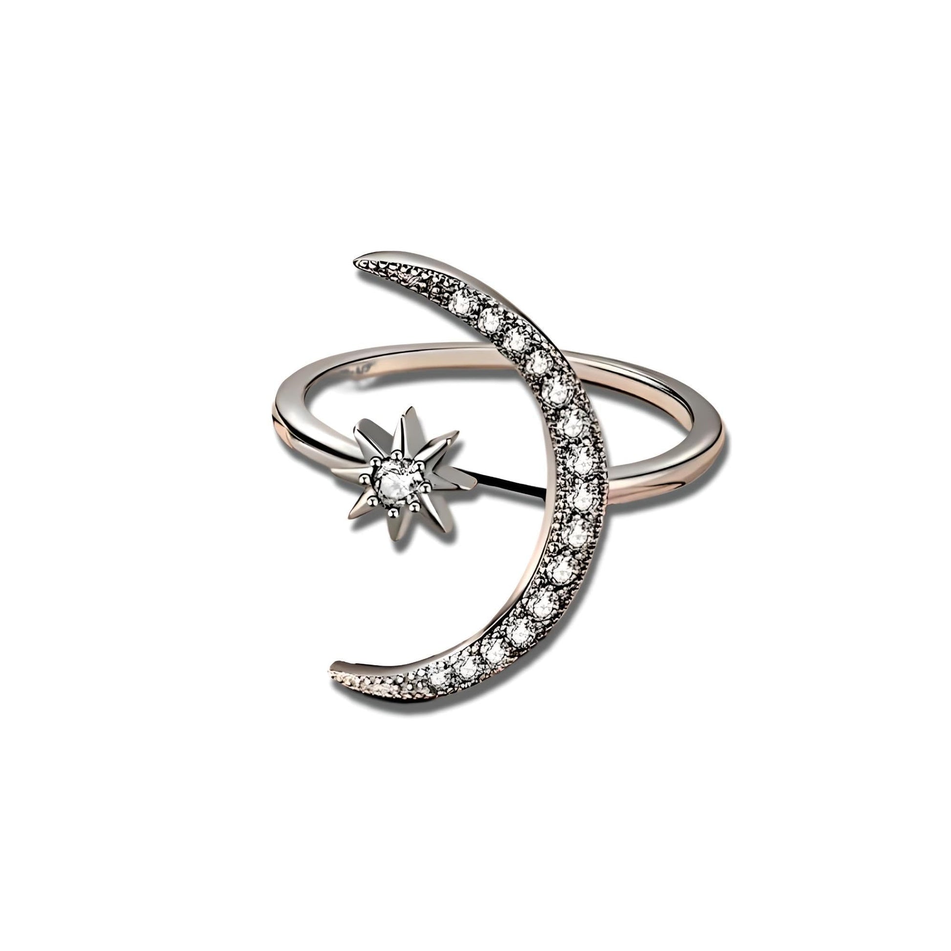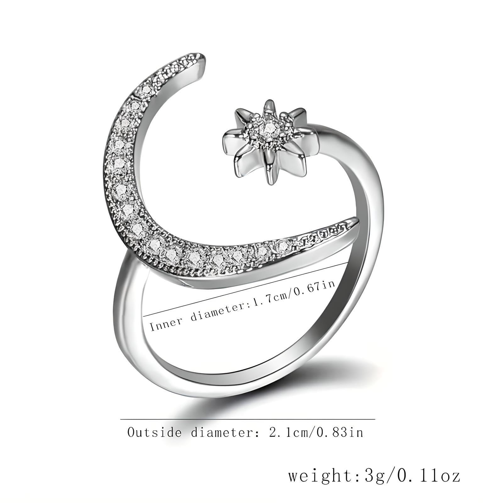 - Elegant Moon & Sun Design: The ring showcases a delicately crafted crescent shape, adorned with sparkling rhinestones that mimic the luminous glow of the moon and sun. This celestial-inspired design adds a touch of ethereal beauty to your ensemble, making it a standout piece in any jewelry collection.