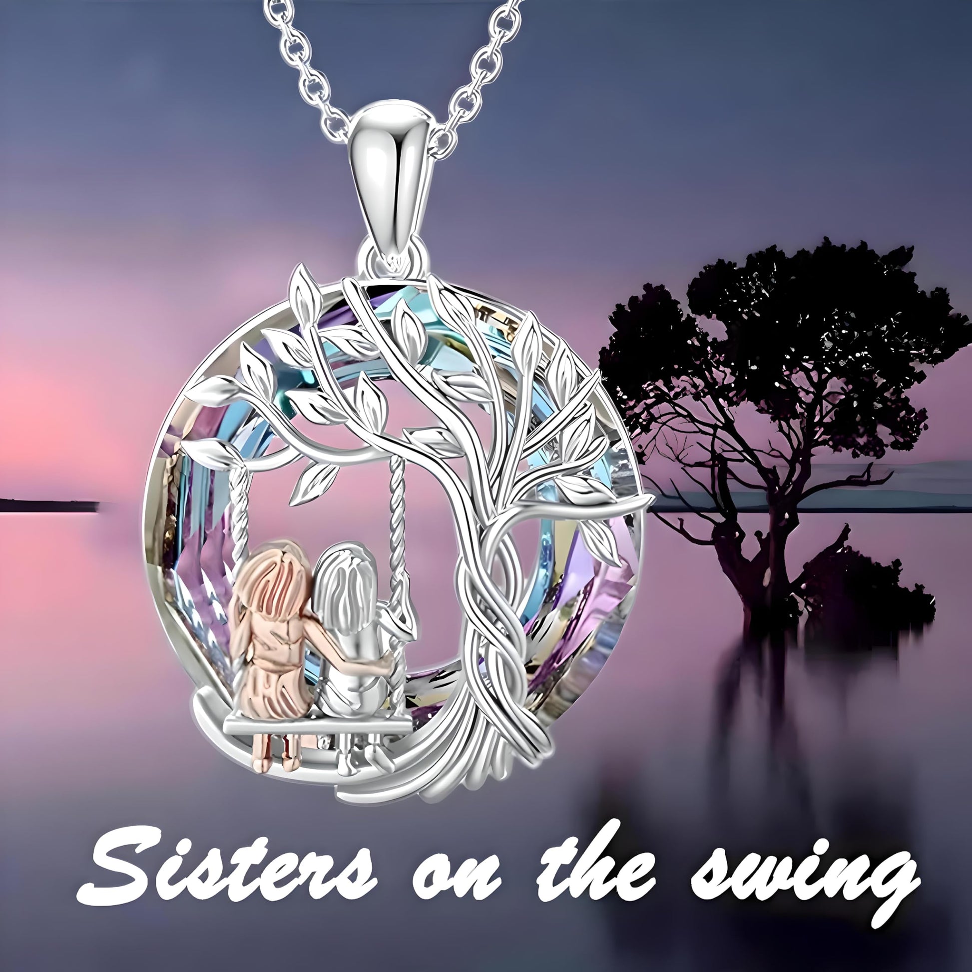 2 PC Tree of Life Pendant + Swinging Necklace, Silver Chain, Rainbow Crystal Accents, Vintage Swing Design