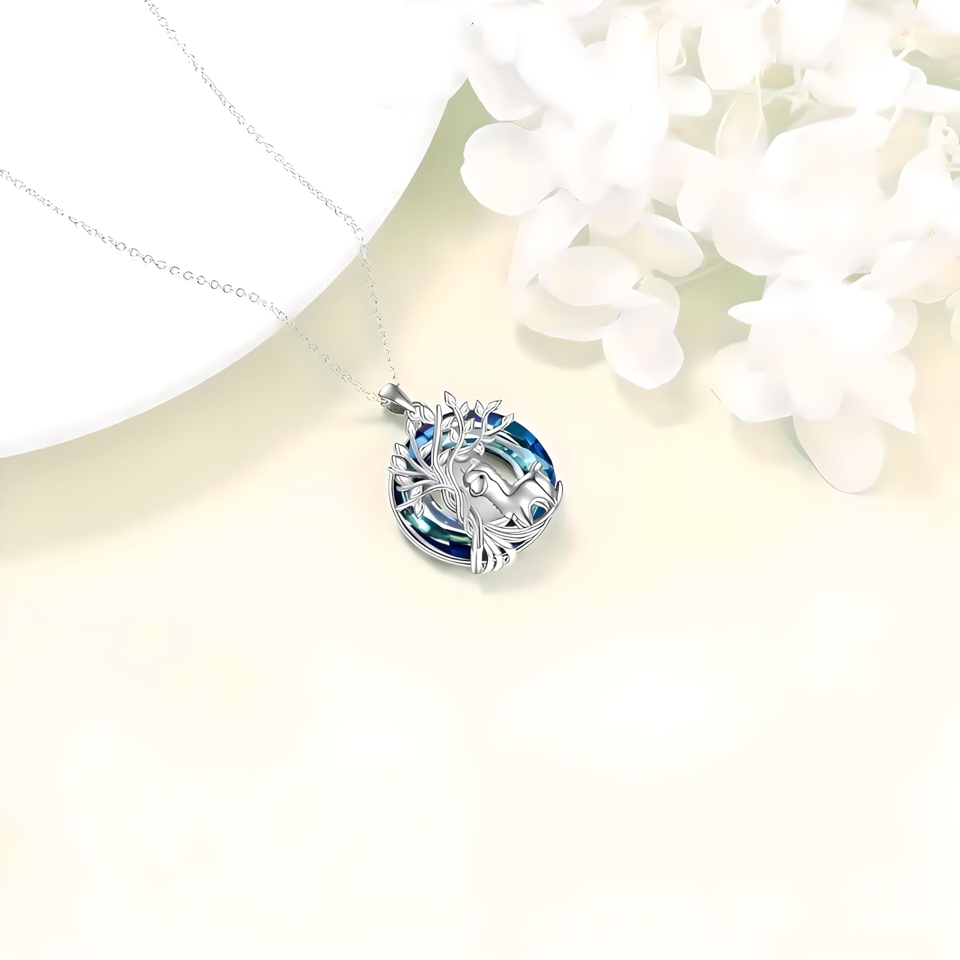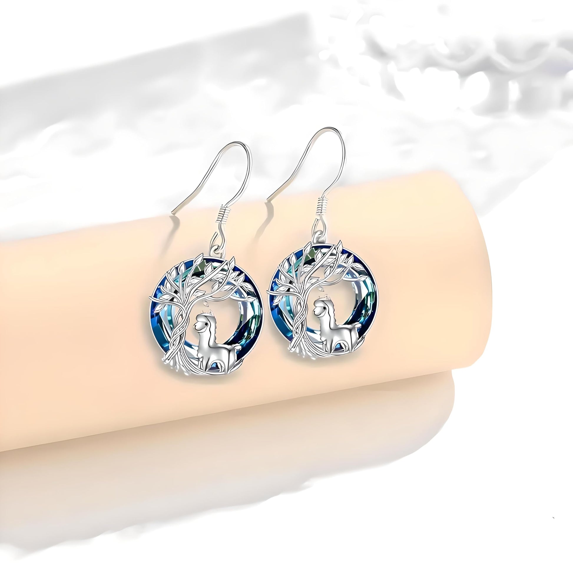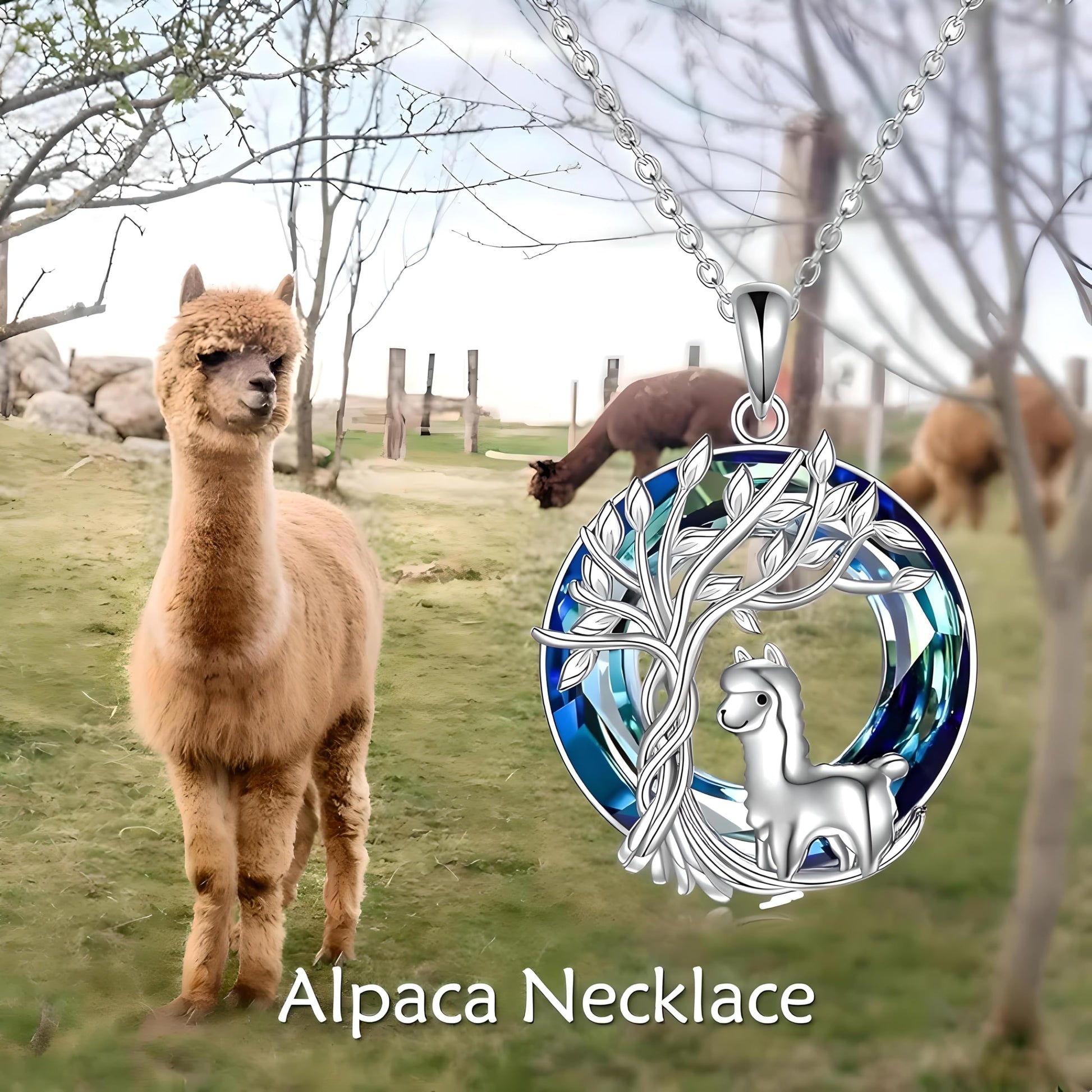 - ELEGANT DESIGN: Stunning tree of life jewelry set featuring a silver alpaca figure surrounded by delicate leaf details and blue crystal background
