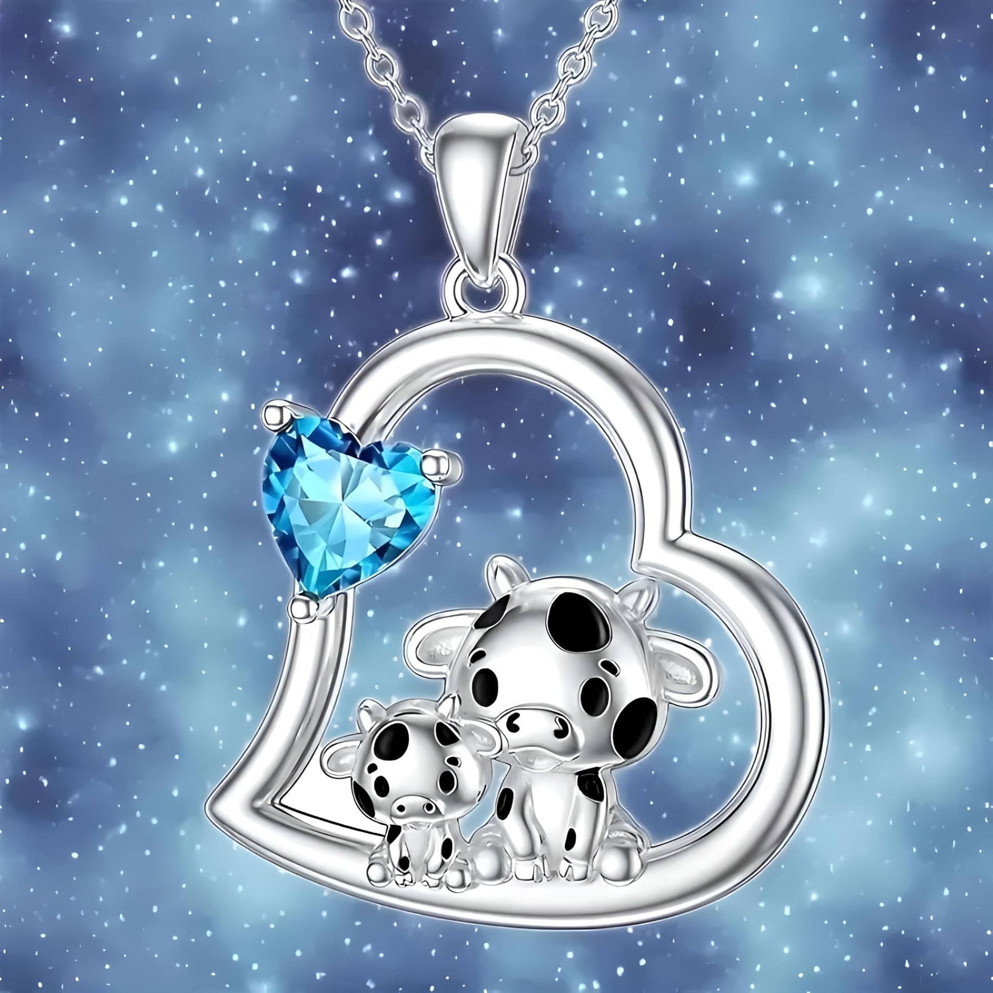Blue Heart Shaped Mother and her Calf Cow Pendant Necklace for Women - Mother's Day Gift, Christmas, or Birthday Gift