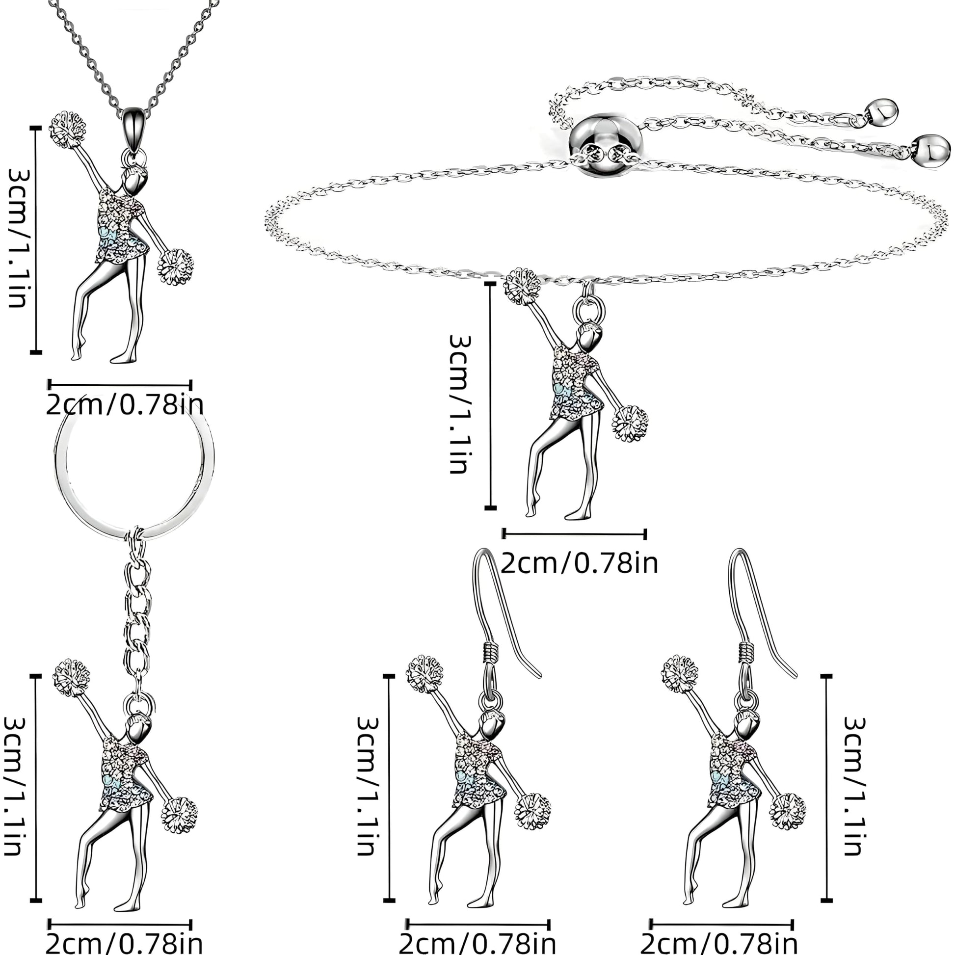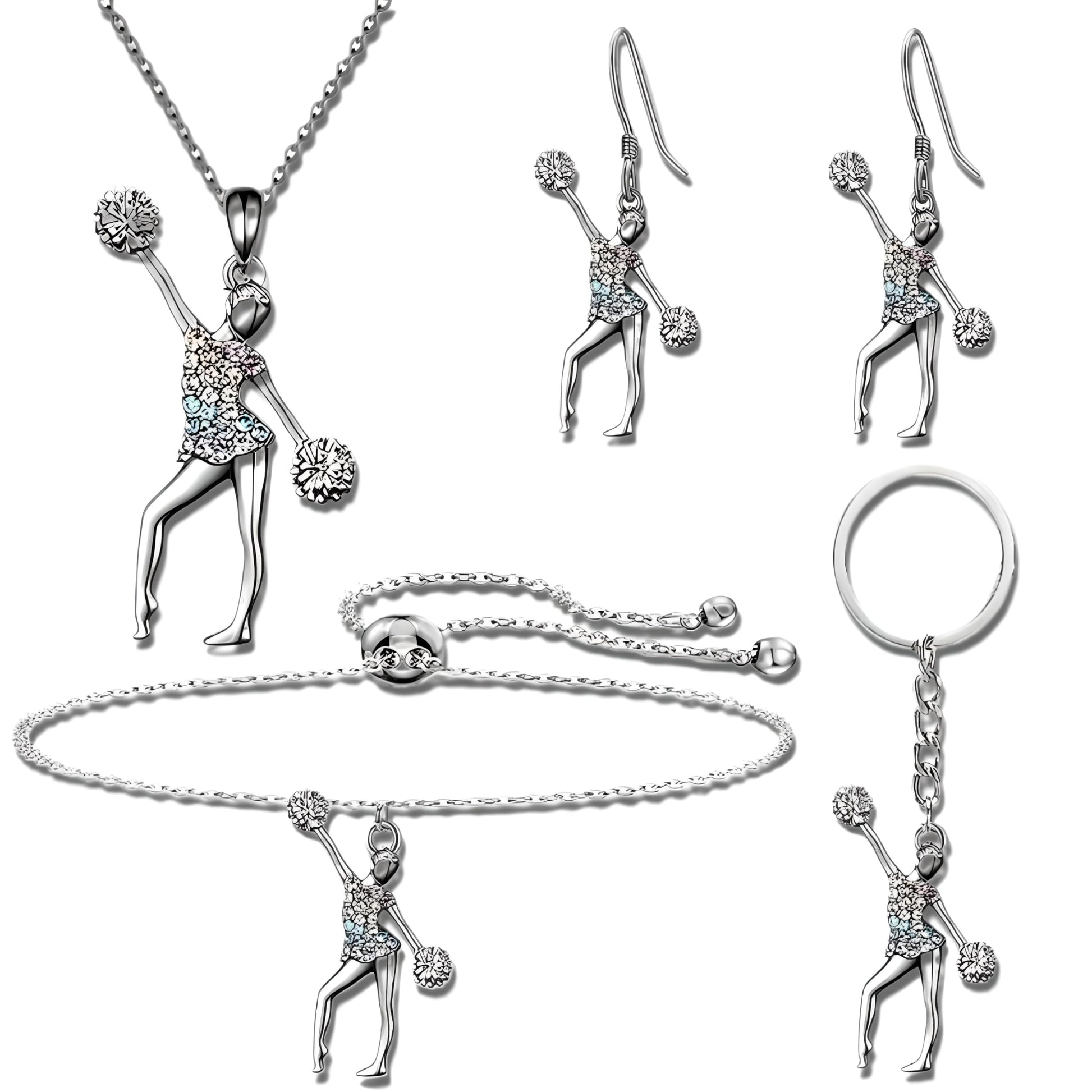 Cheerleader Jewelry Set with Crystal Pendant Necklace, Bracelet, Earrings and Keychain, Silver