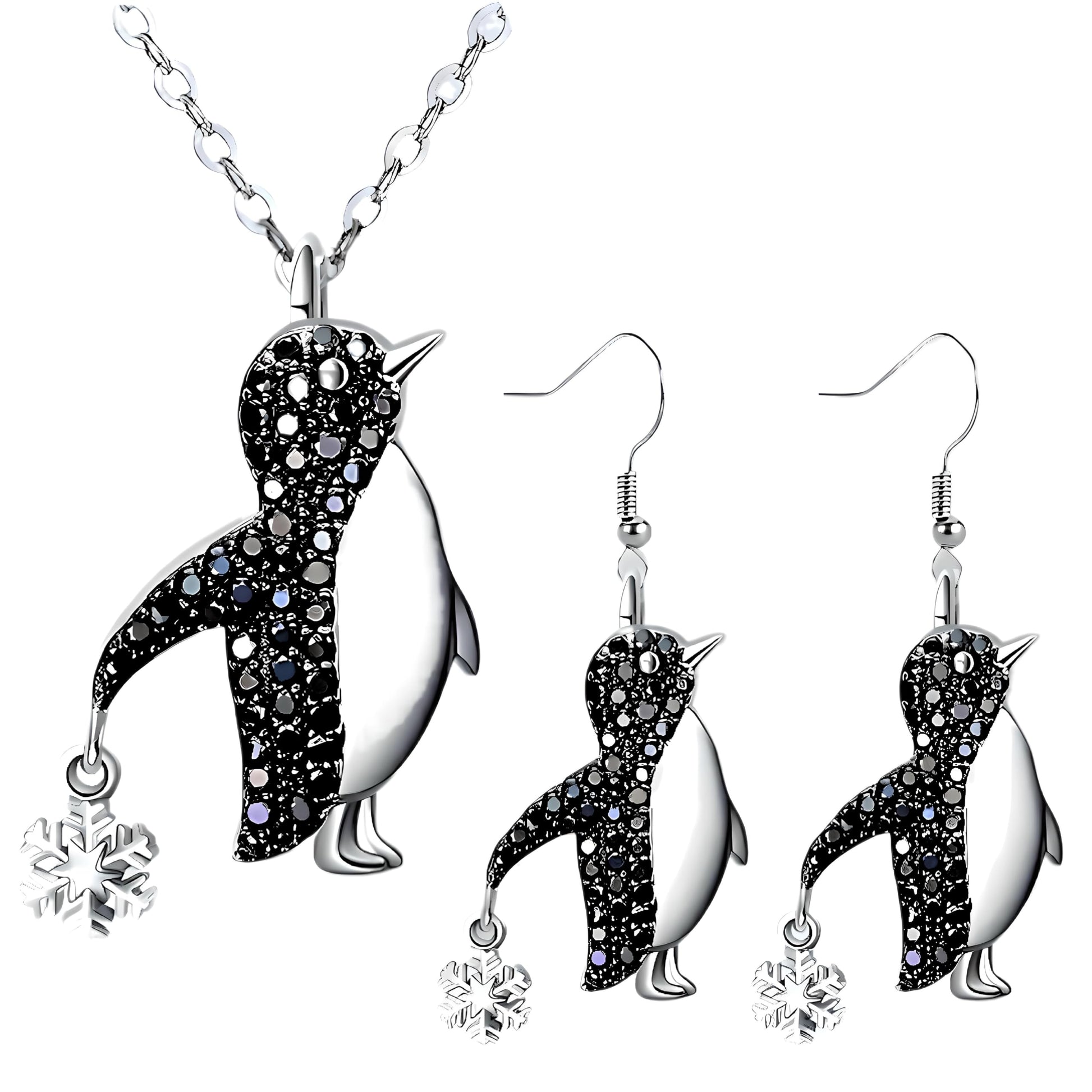 - DESIGN FEATURES: Elegant penguin-themed jewelry set featuring black crystal-studded design with silver-toned accents and delicate snowflake charms