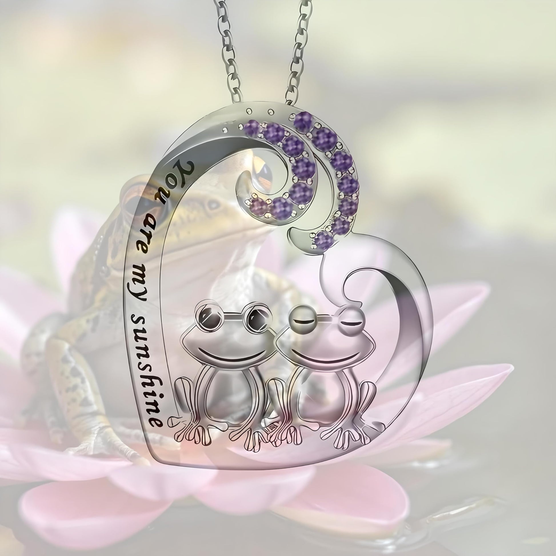- DESIGN: Sterling silver heart pendant featuring two adorable frogs and crystal accents, with 'You are my sunshine' engraved message