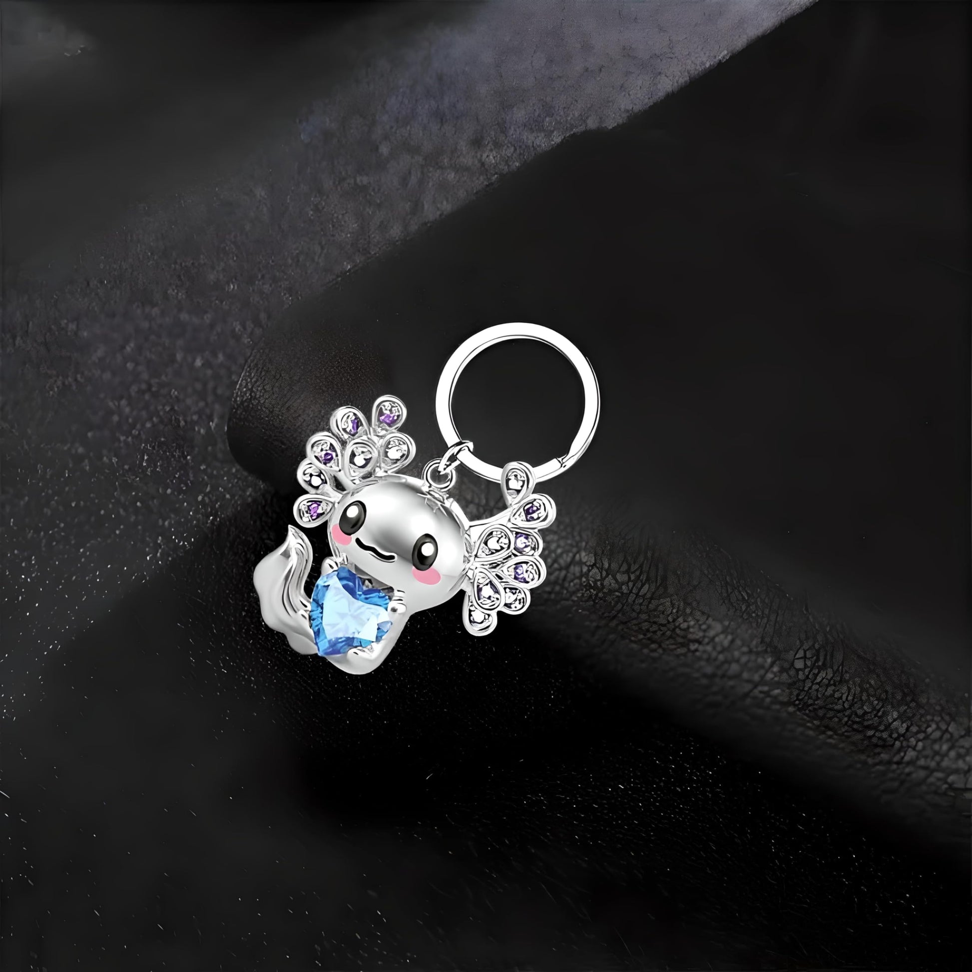 Cute Salamander Jewelry Set with Blue Crystal Heart, Silver Necklace, Earrings, Bracelet and Keychain