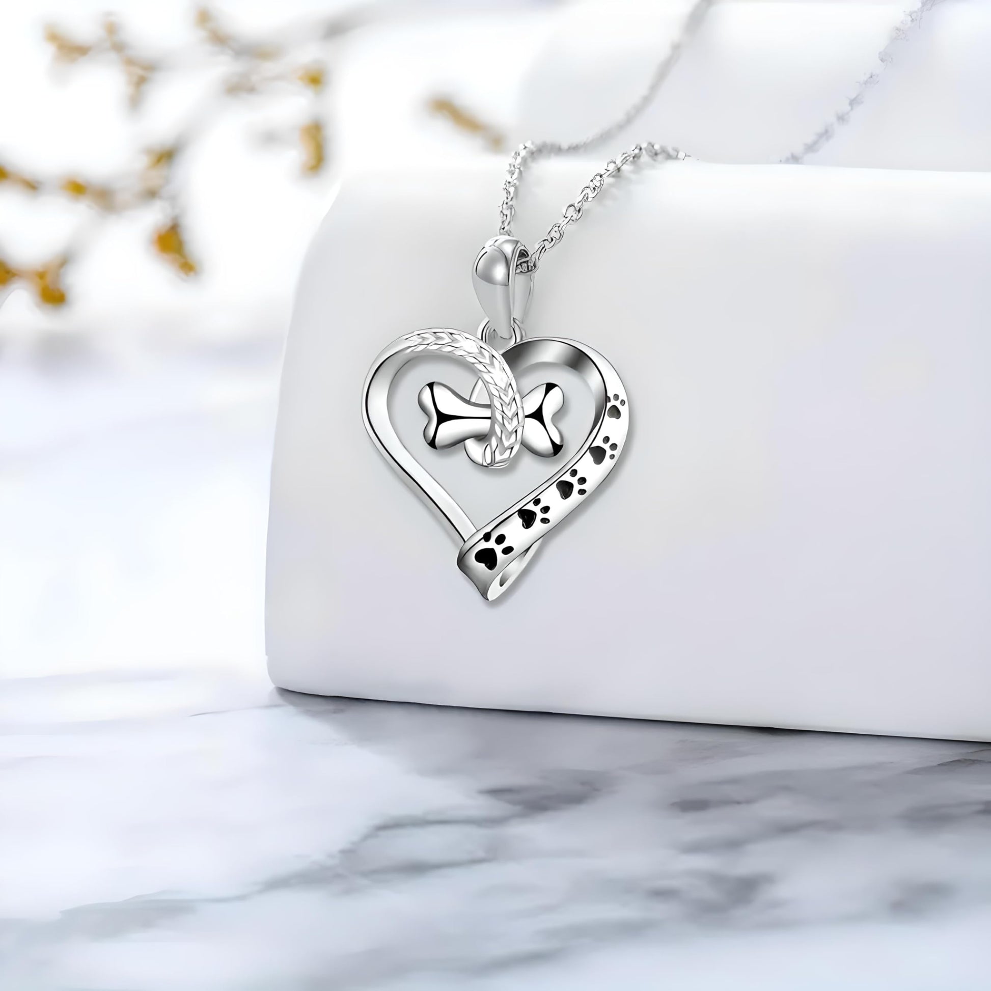 Dog Lover Heart Pendant Necklace with Bone Charm and Paw Prints, Stainless Steel Chain 17.7", Pet Memorial Jewelry