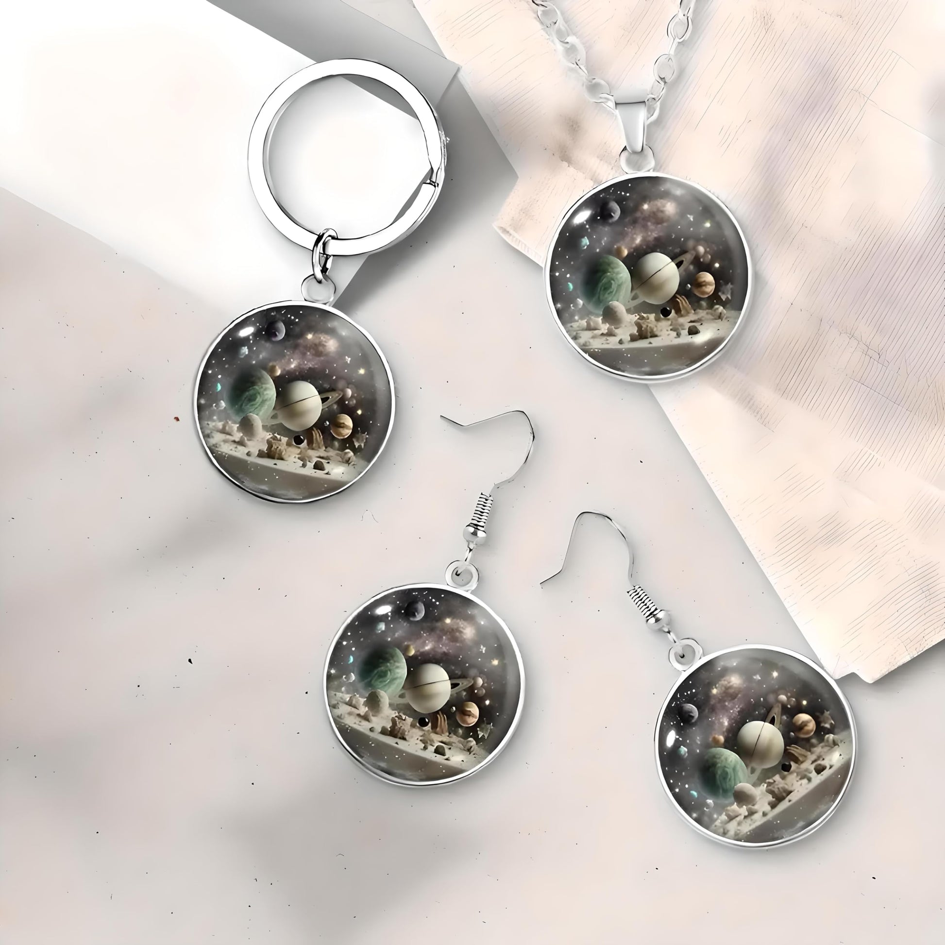 - COMPLETE SET: Stunning space-themed jewelry set includes a pendant necklace with 18.1-inch chain, matching earrings, and a coordinating keychain