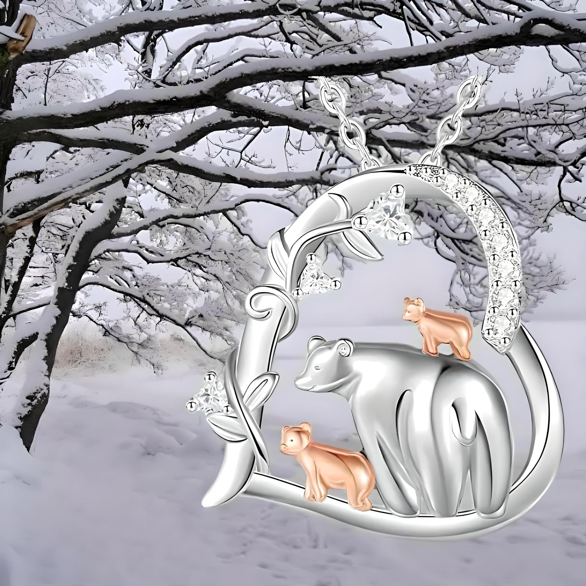 Heart-Shaped Mama Bear with Her Two Cubs Pendant Necklace for Women, Silver Plated, Synthetic Gemstones