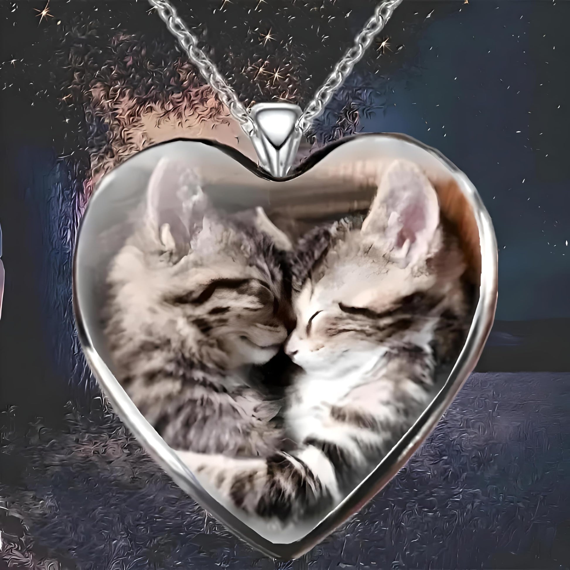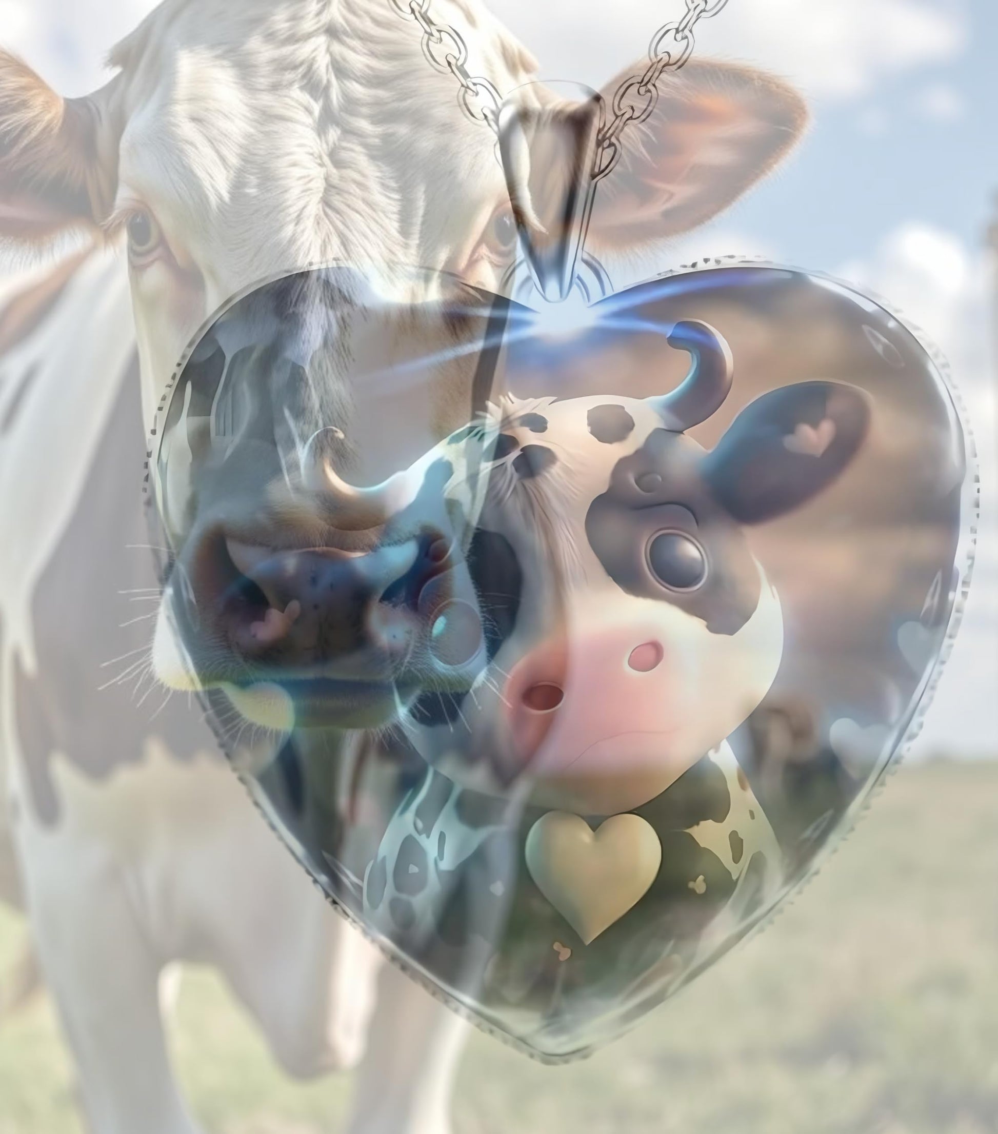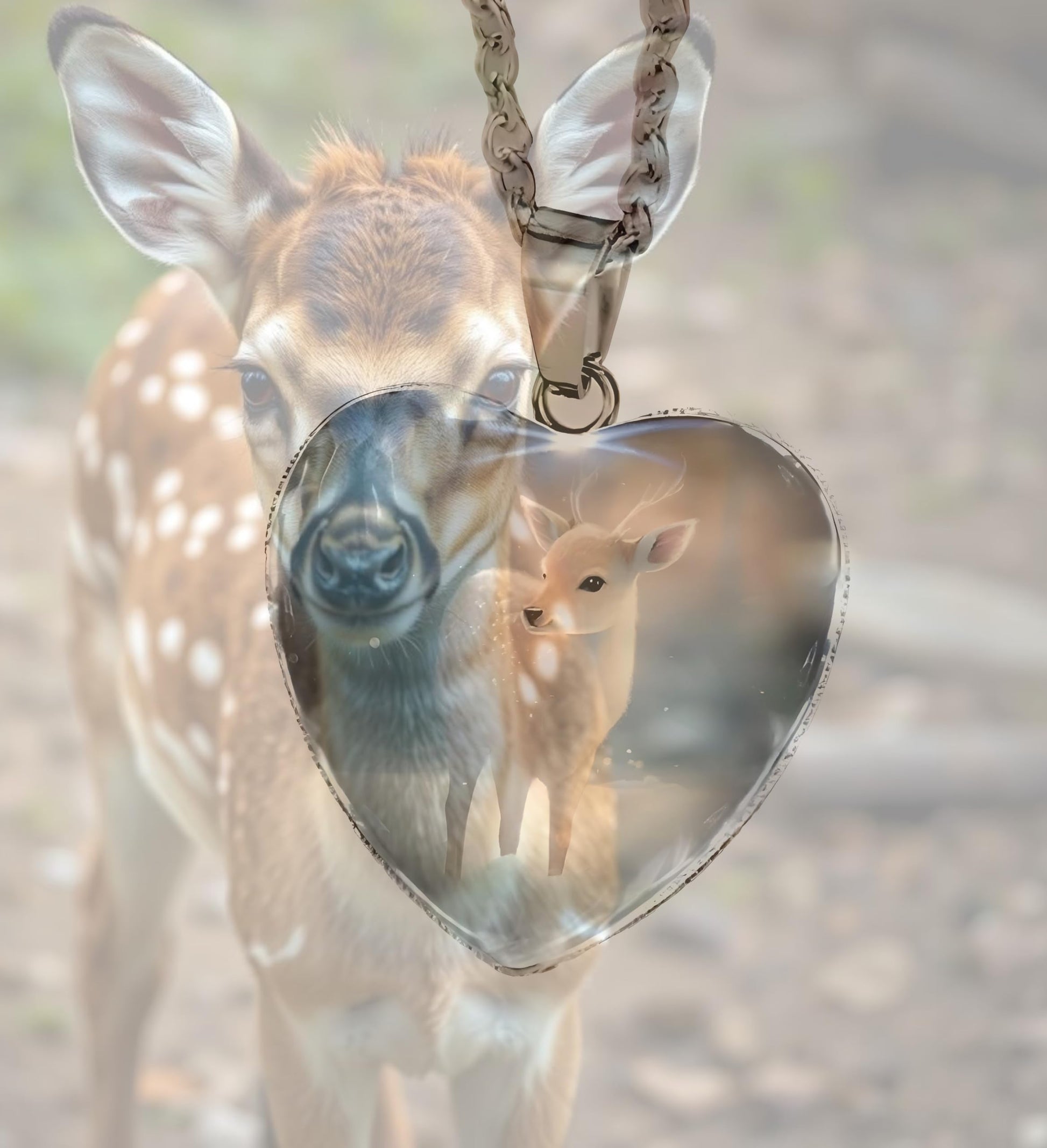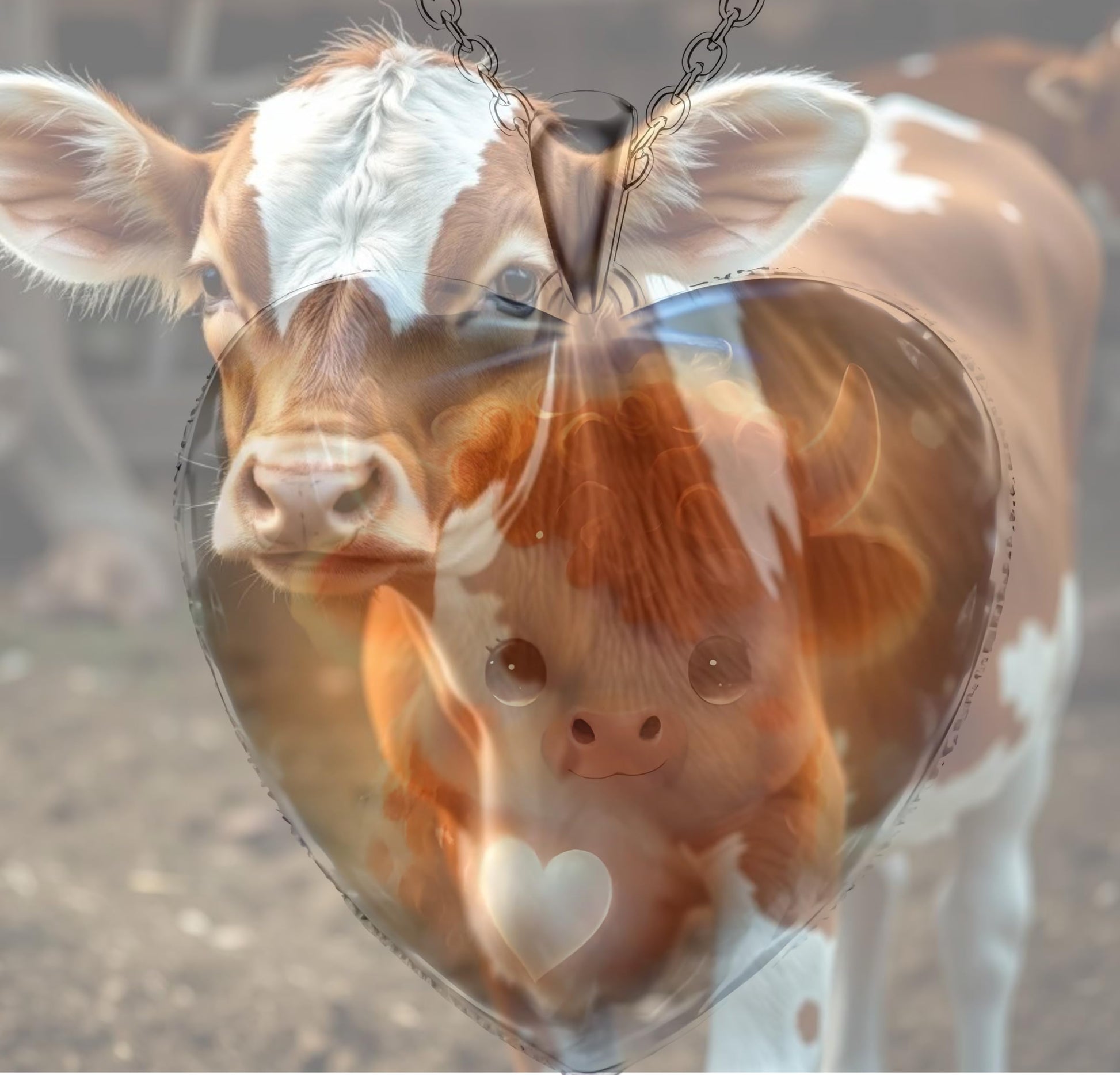 - This heart-shaped pendant features an endearing animal with a glowing heart, set against a beautiful background.