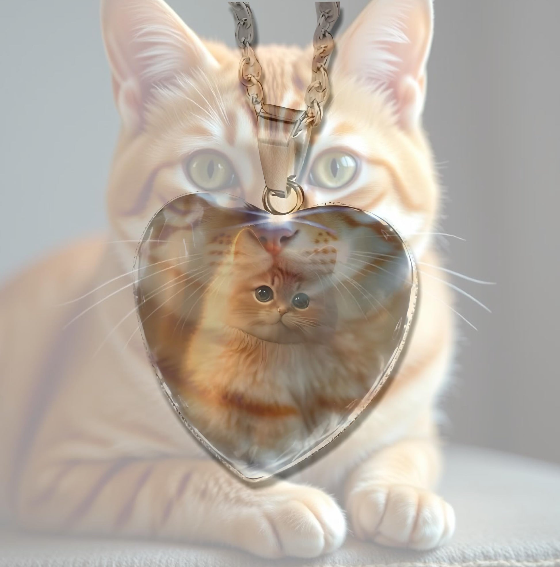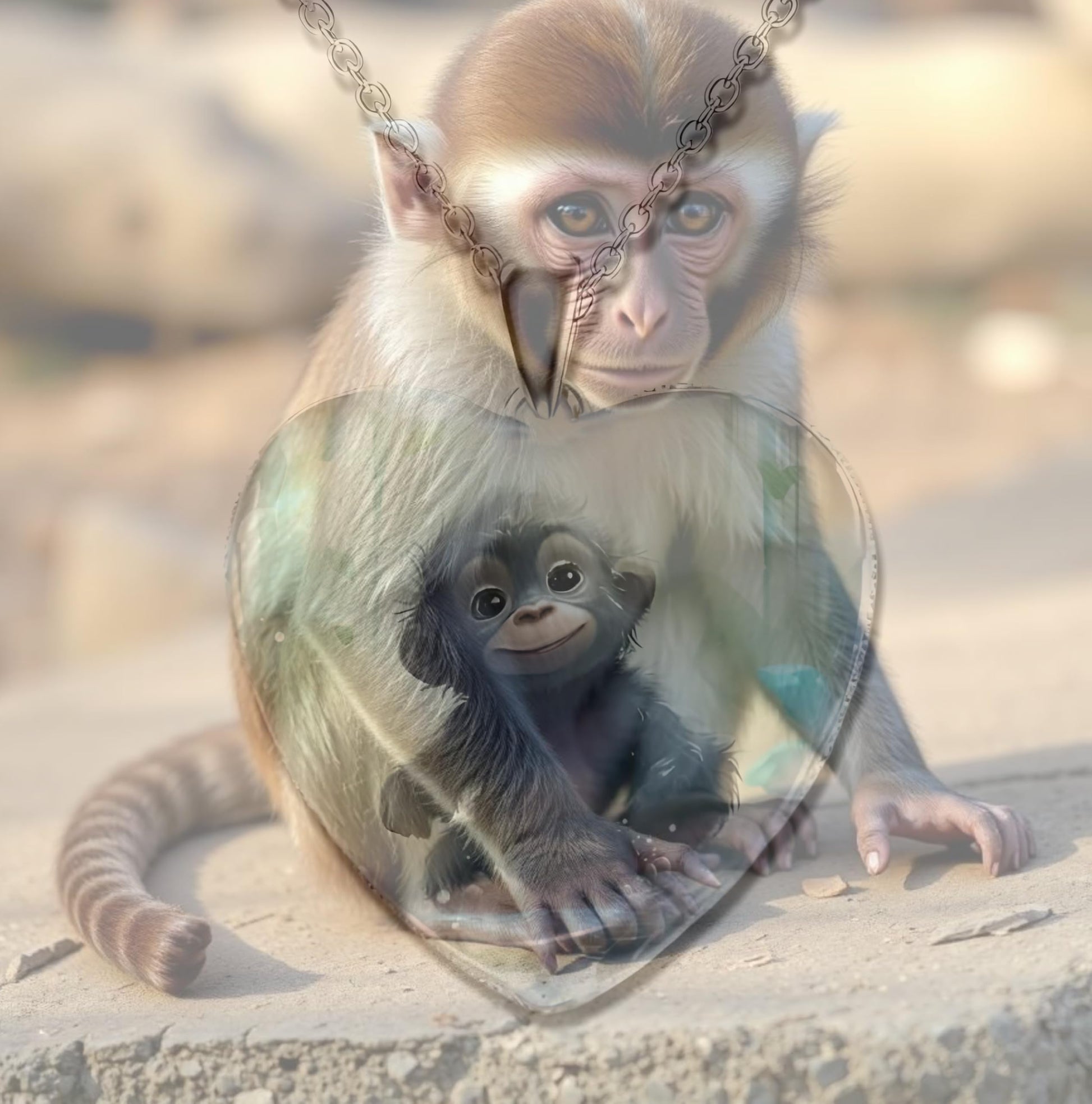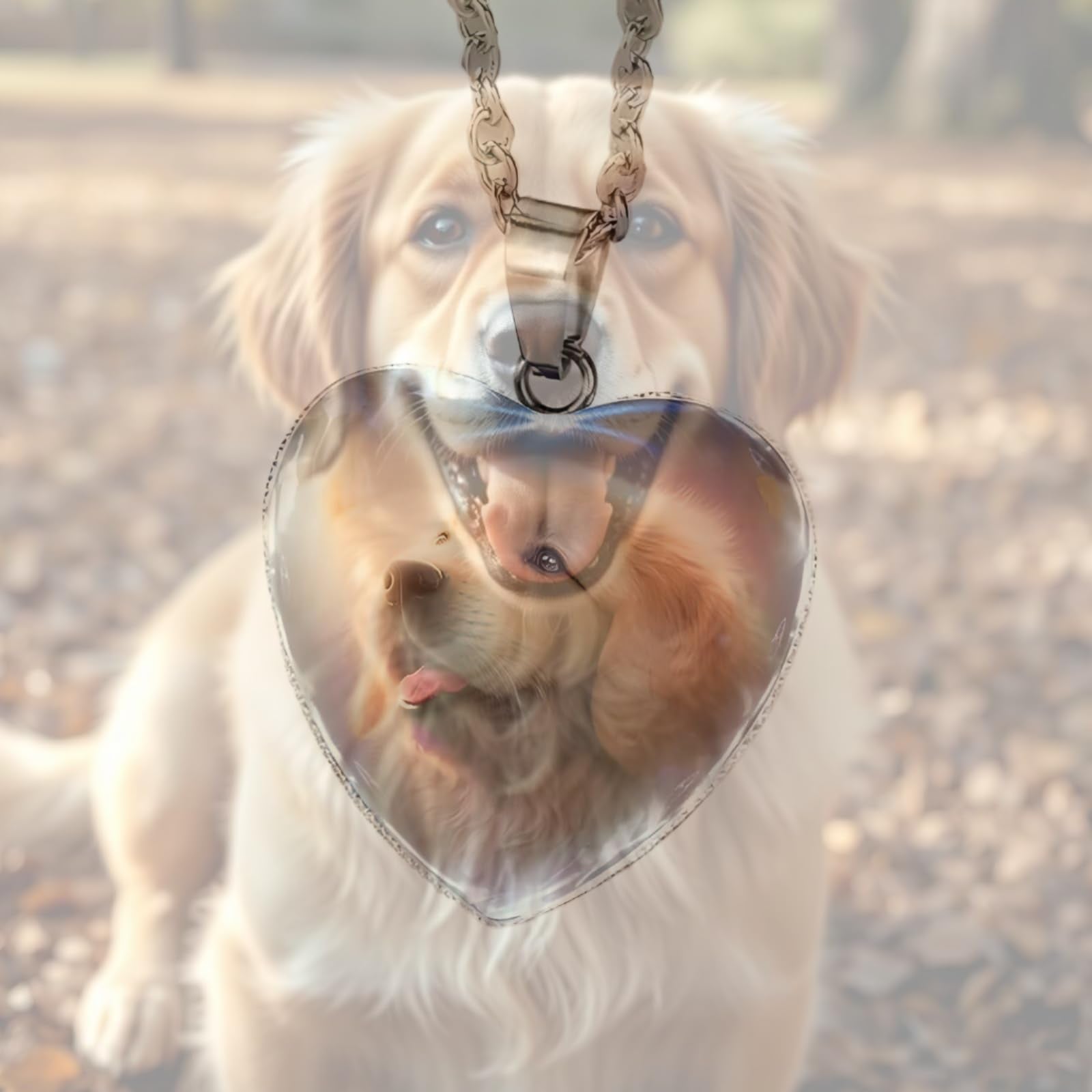- This heart-shaped pendant features an endearing animal with a glowing heart, set against a beautiful background.