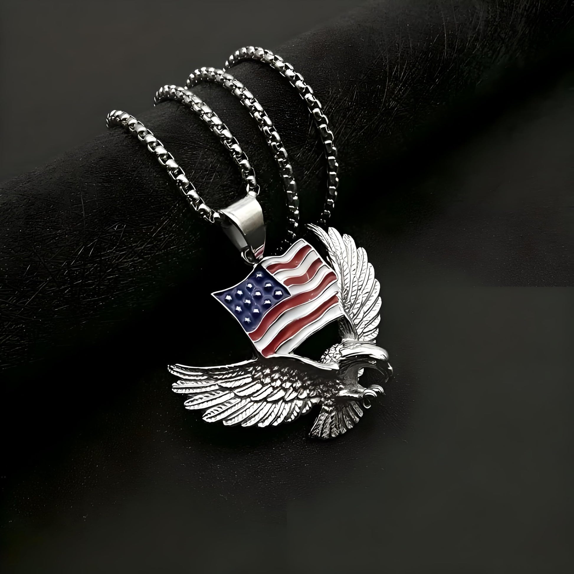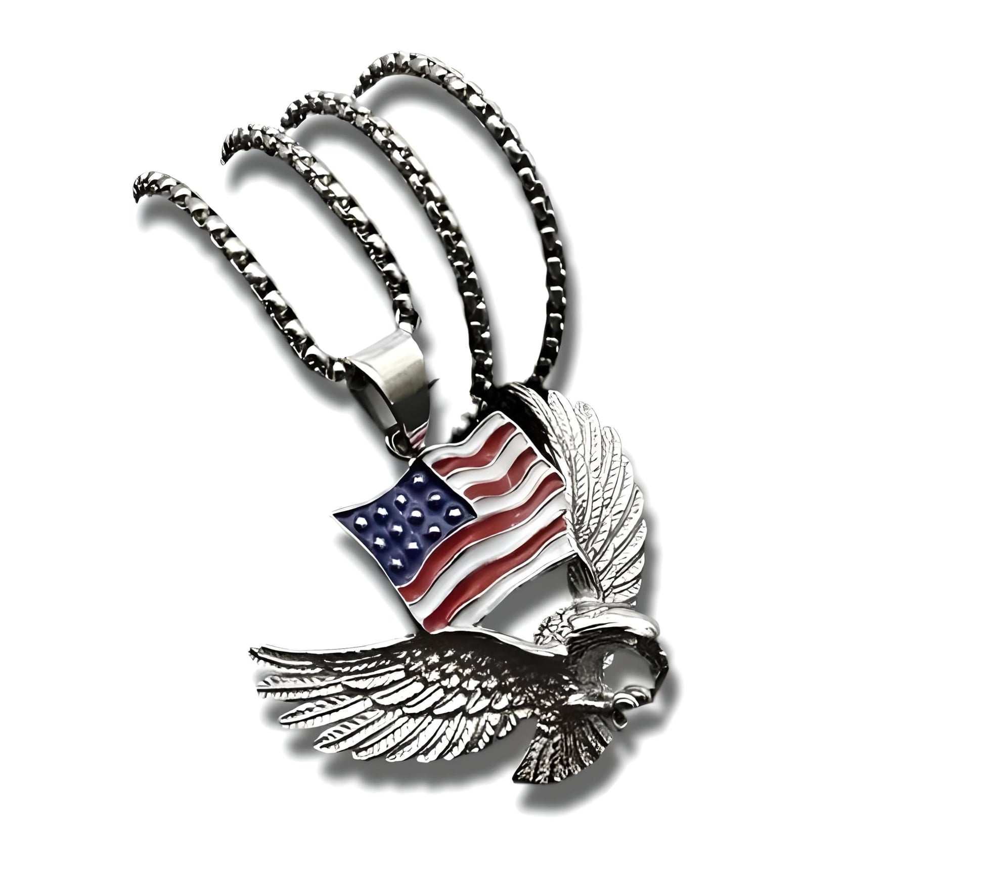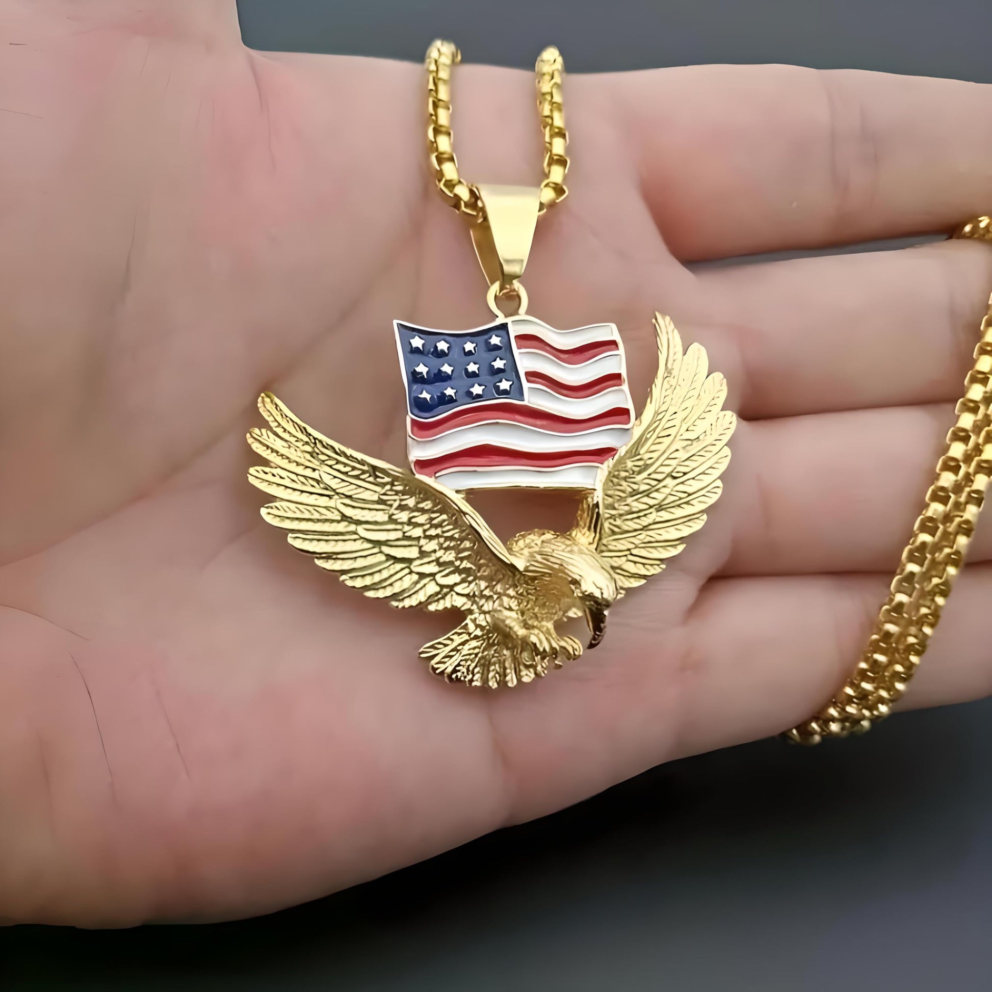 - Unleash your boldness and make a statement with our Men’s Majestic Eagle with American Flag Pendant Necklace. This striking piece of hip-hop jewelry not only showcases unparalleled style but also embodies the spirit of freedom, power, and patriotism. Crafted for those who dare to stand out, this necklace is the perfect addition to any modern man’s accessory collection.