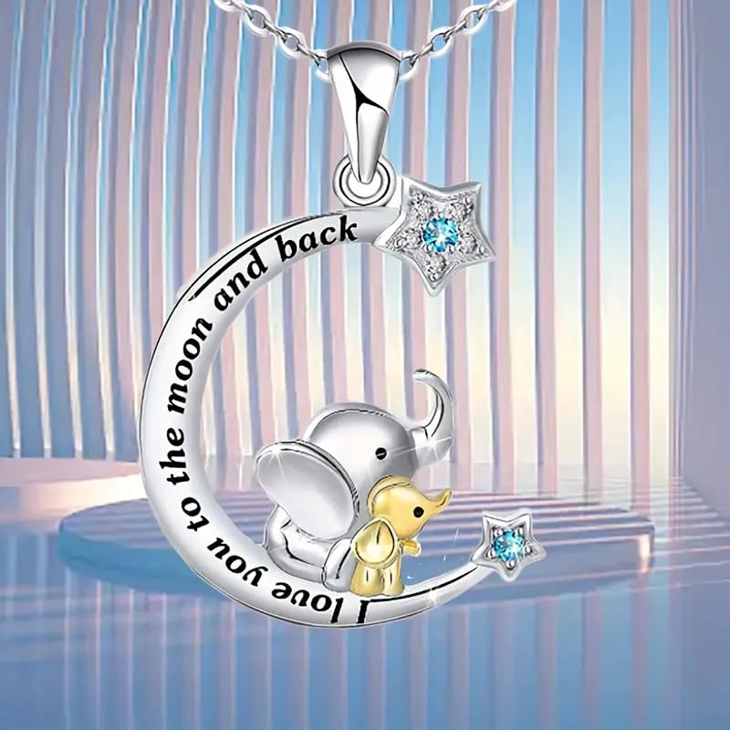 - PENDANT DETAILS: Crescent moon pendant adorned with two blue crystal stars and detailed elephant figures creates an enchanting celestial scene