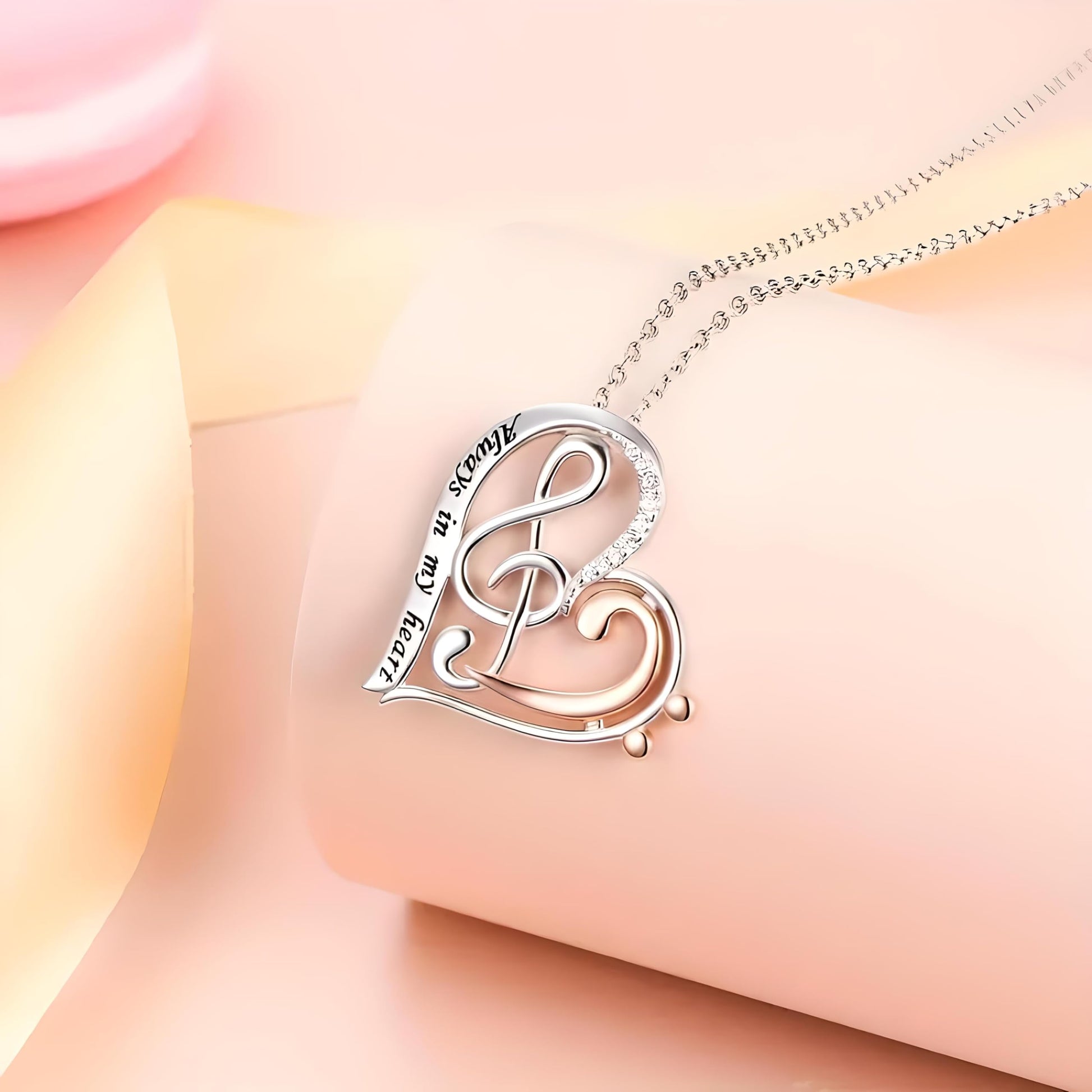 - ELEGANT DESIGN: Two-tone sterling silver and rose gold heart pendant featuring a musical treble clef motif with sparkling crystal accents