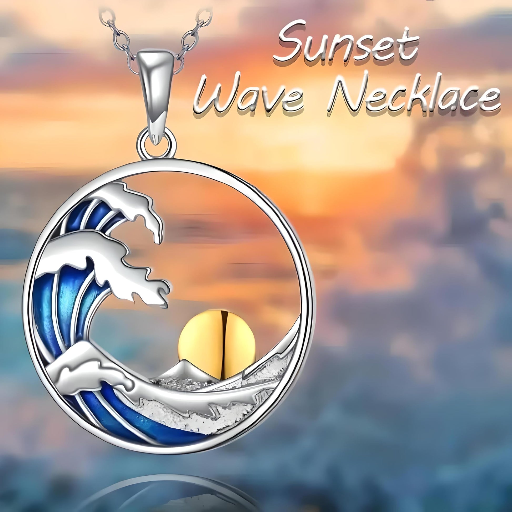 - DESIGN FEATURES: Stunning ocean wave pendant featuring blue enamel waves and golden sun design in a circular sterling silver frame