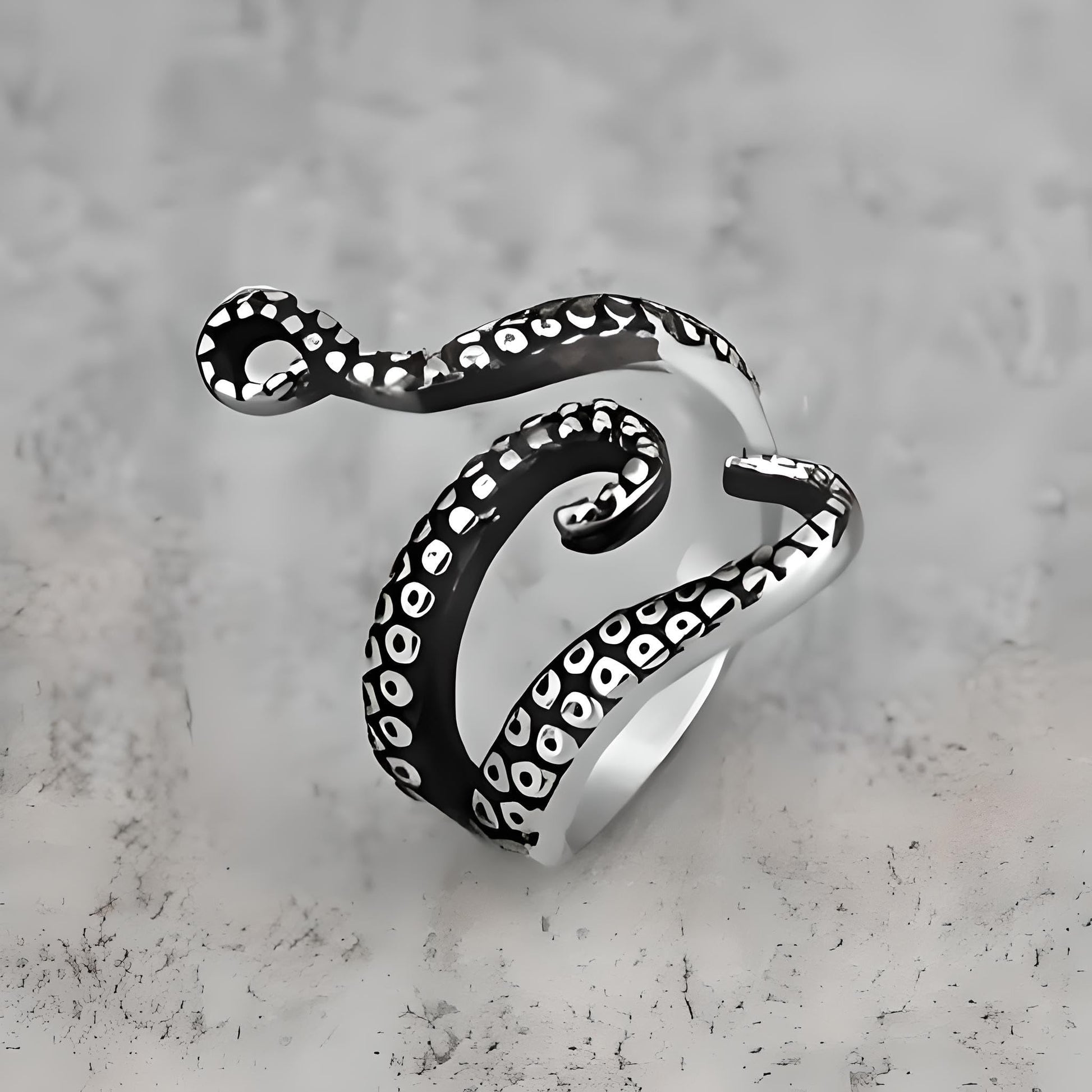 - UNIQUE DESIGN: Intricately detailed octopus tentacle wraps around your finger in a striking spiral pattern with detailed suction cup texture in black and silver finish