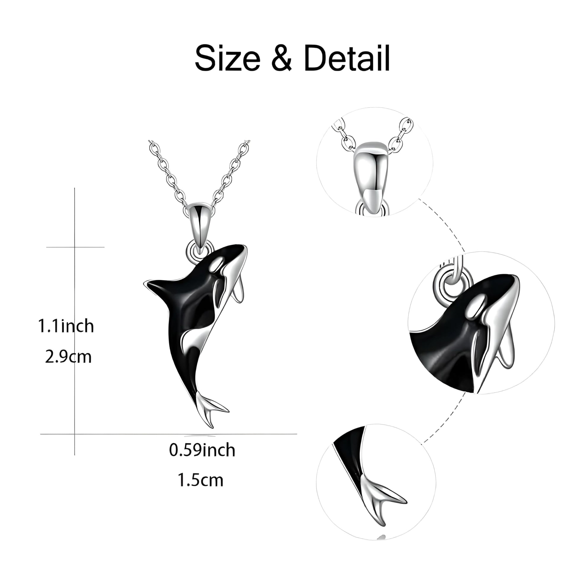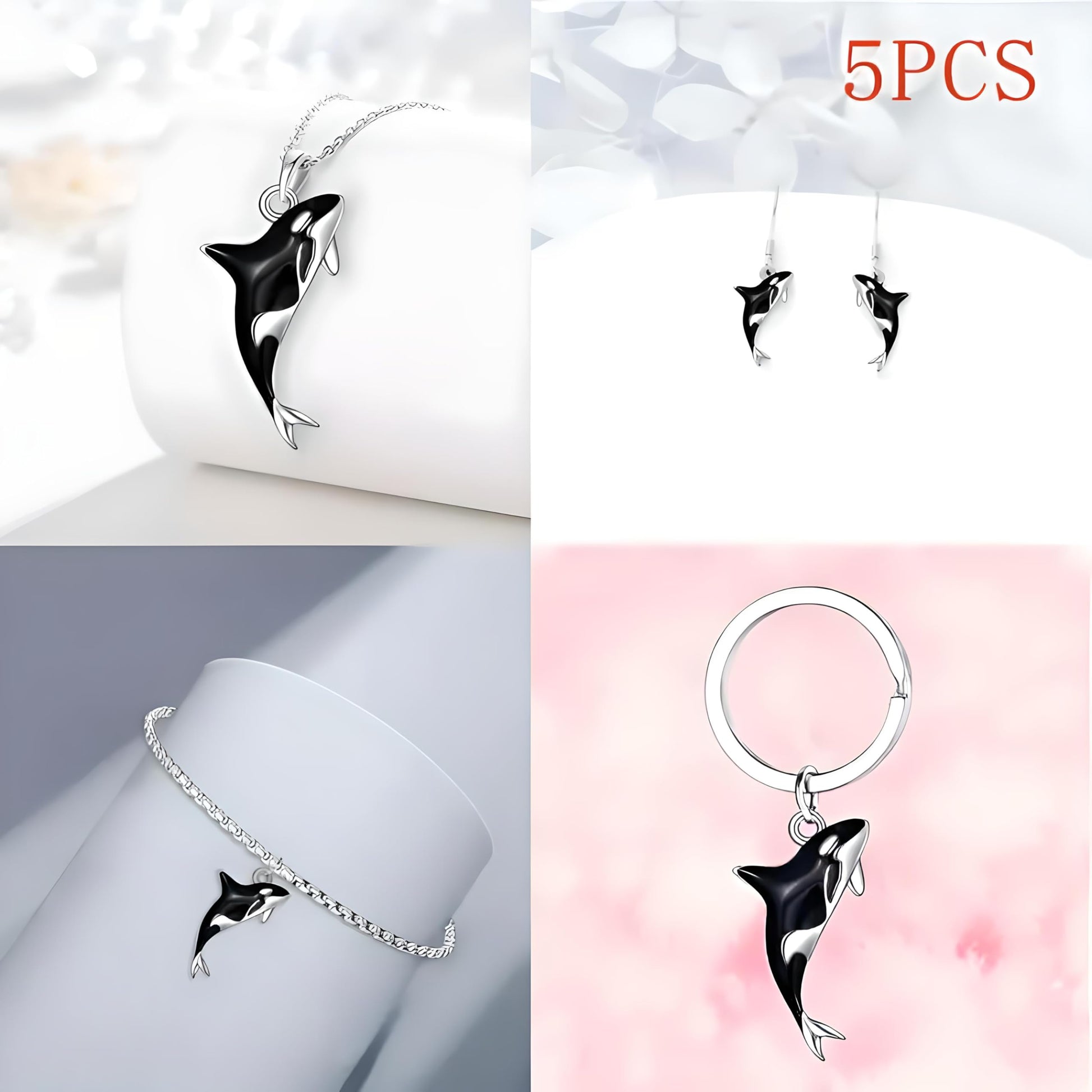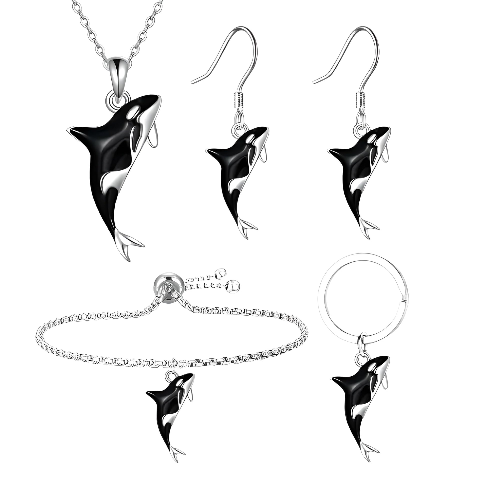 - COMPLETE SET: Features a matching orca whale pendant necklace, dangle earrings, adjustable bracelet, and keychain in elegant black and silver design