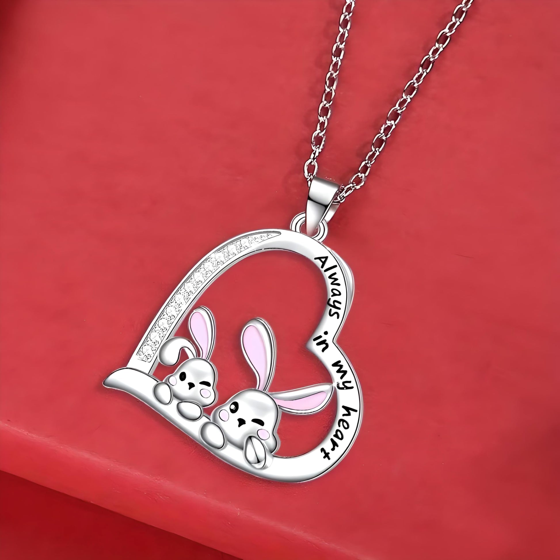 - The necklace features an enchanting design of two adorable bunnies nestled within a heart, symbolizing companionship and unconditional love. The intricate detailing captures the playful spirit of these beloved animals, making this pendant a whimsical yet meaningful addition to any jewelry collection.