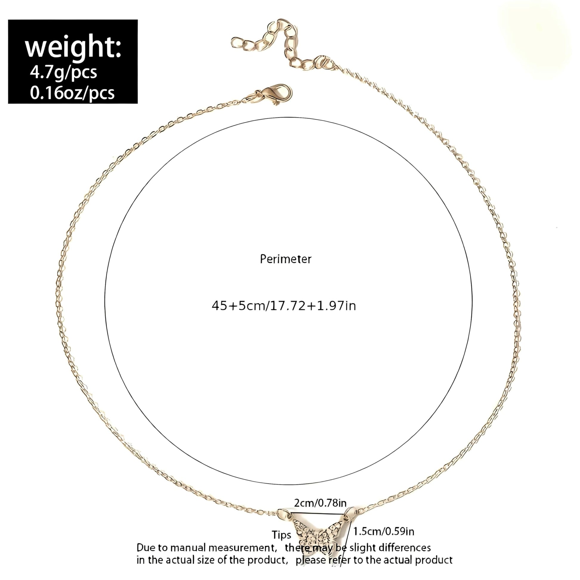 - Weight: 0.16oz Chain Length: 17.72in + 1.97in Butterfly Pendant: 0.78in (2cm) Length. 0.59in (1.5cm) Height