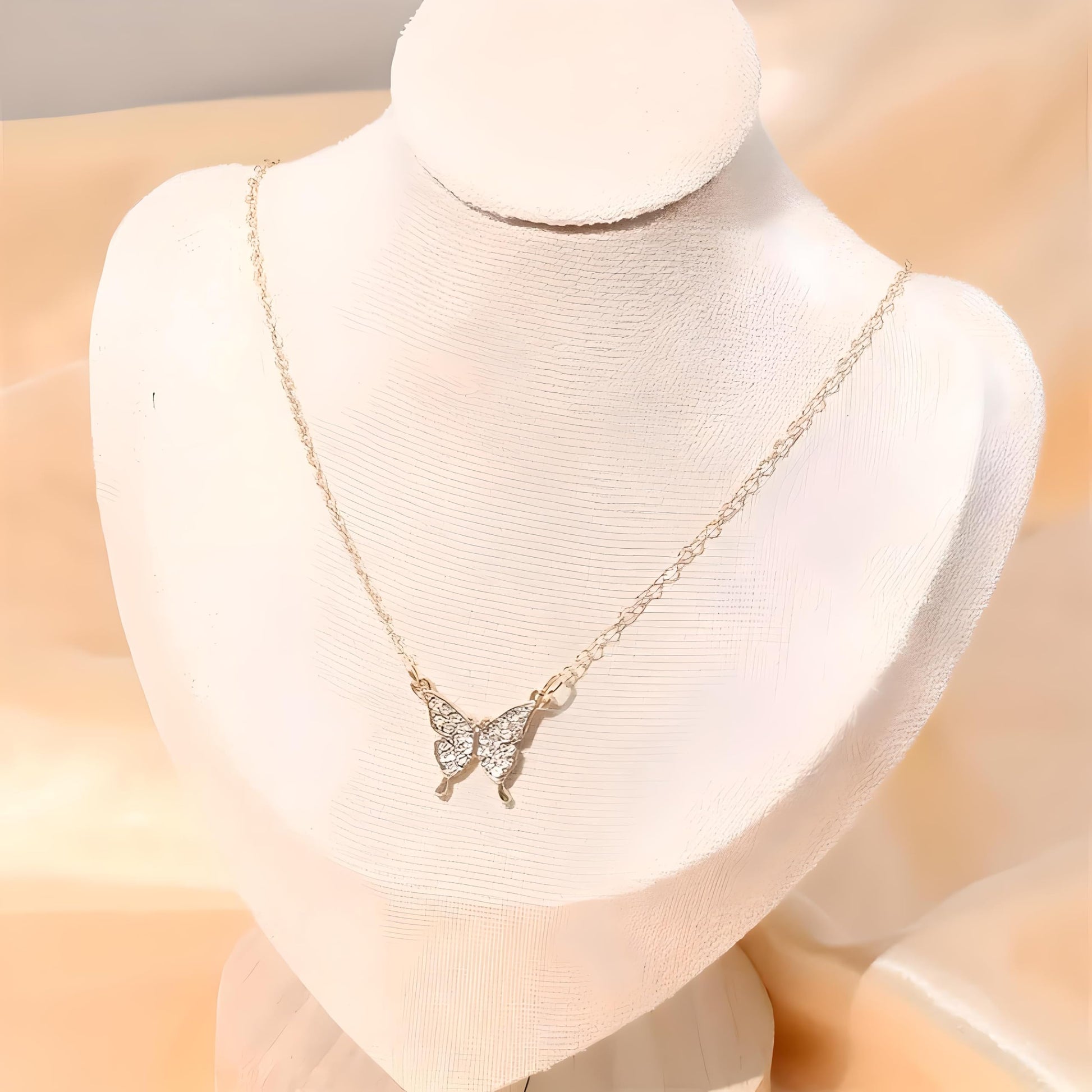 - Indulge in the allure of timeless beauty with our Butterfly Simulated Diamonds Gold Necklace. Whether treating yourself or gifting to a loved one, this necklace is sure to be cherished for years to come, serving as a symbol of elegance, sophistication, and the enduring beauty of nature.