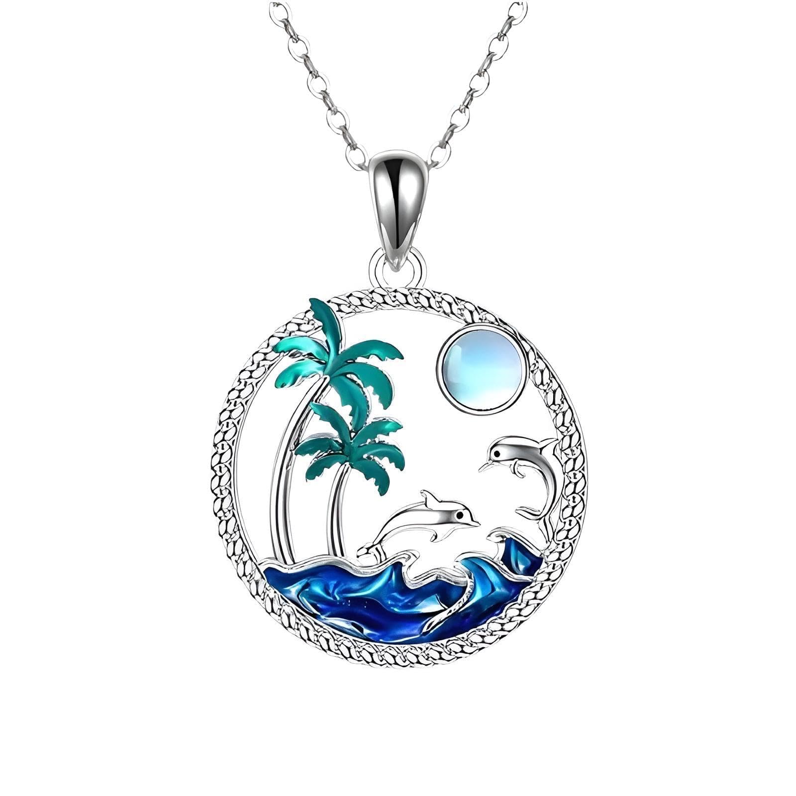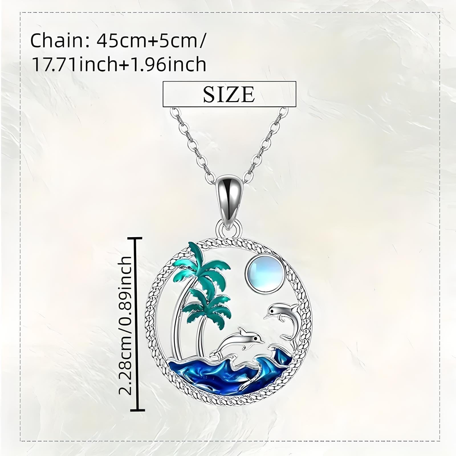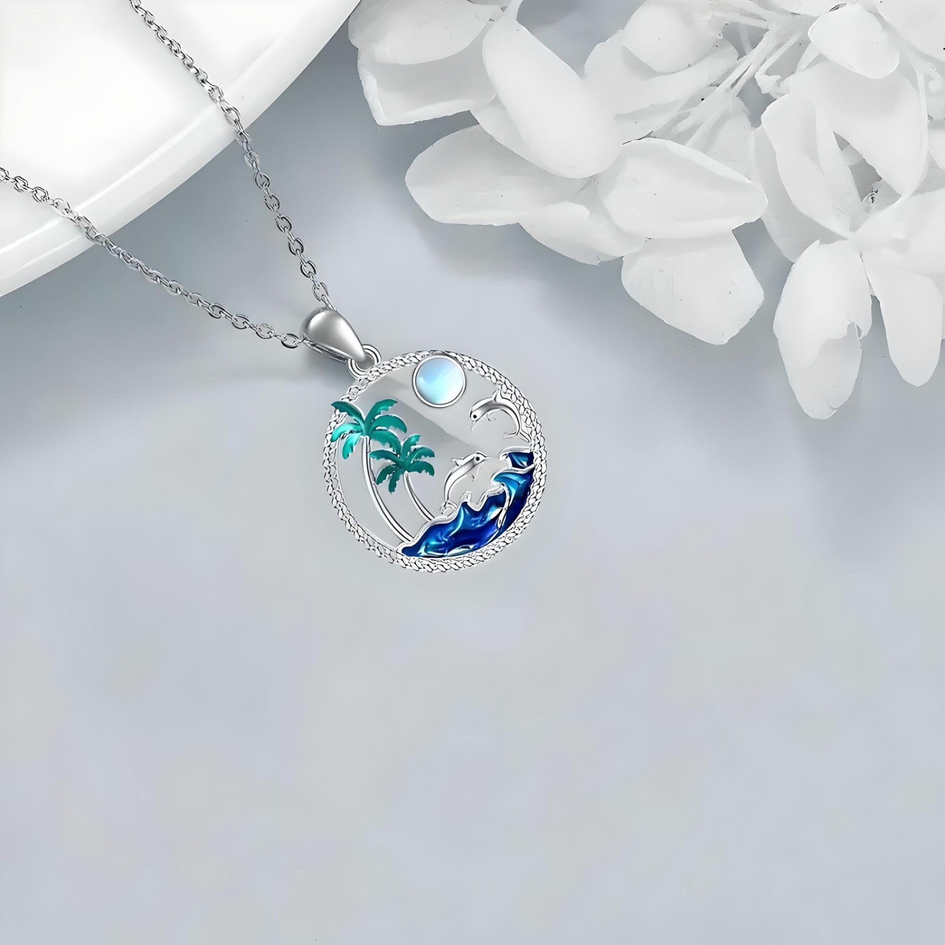 - DESIGN ELEMENTS: Beautifully crafted pendant featuring turquoise palm trees, playful dolphins, and blue ocean waves in a circular frame with detailed silver border