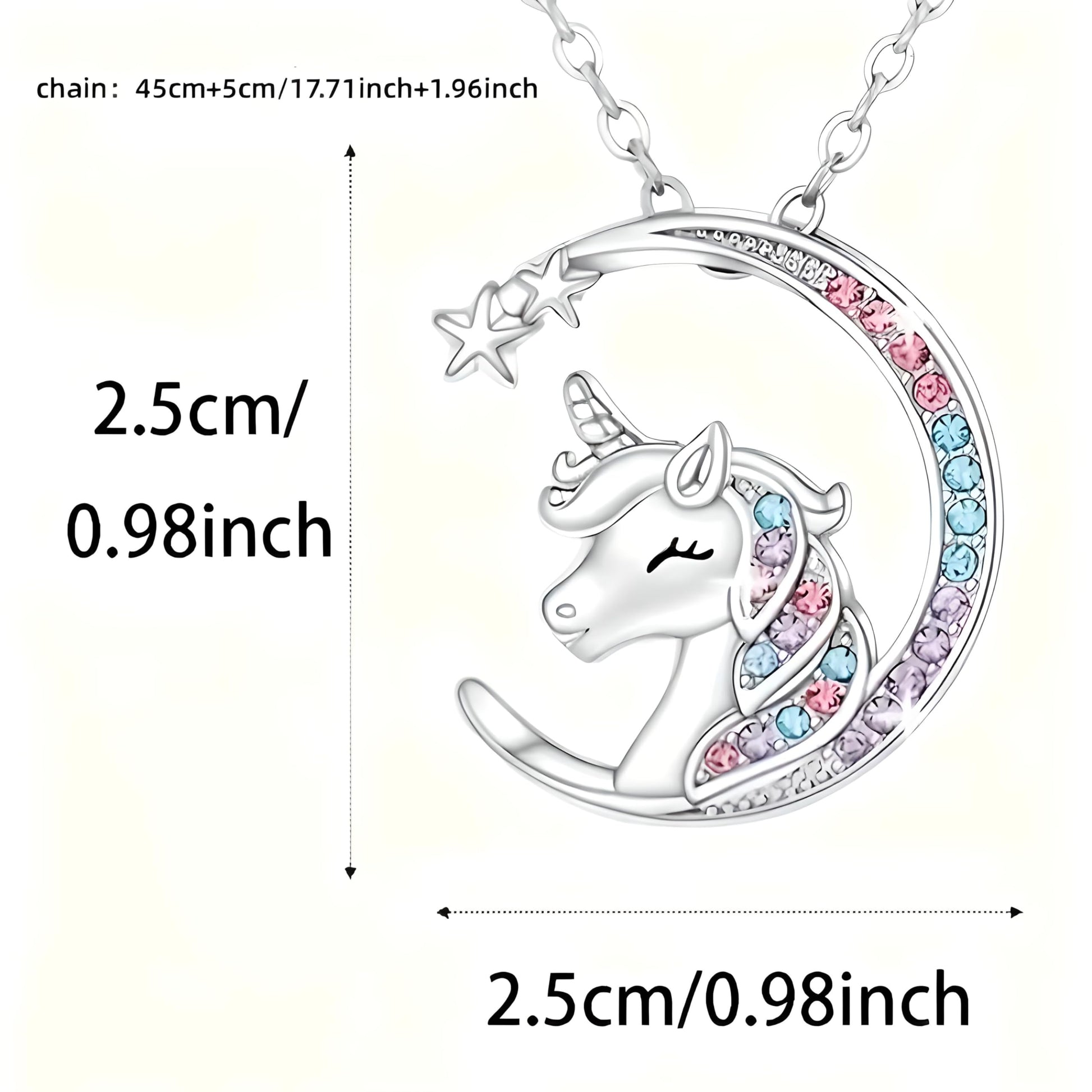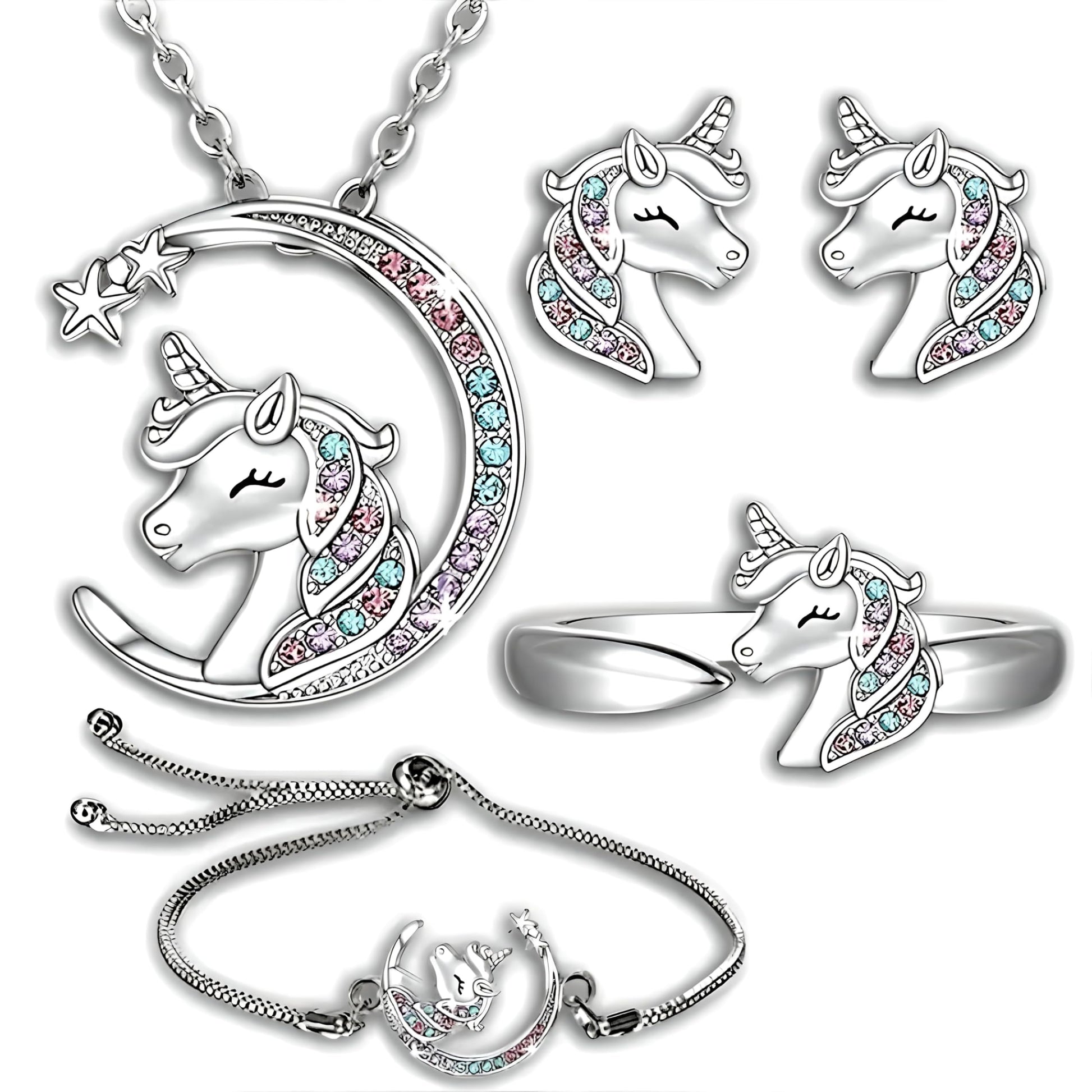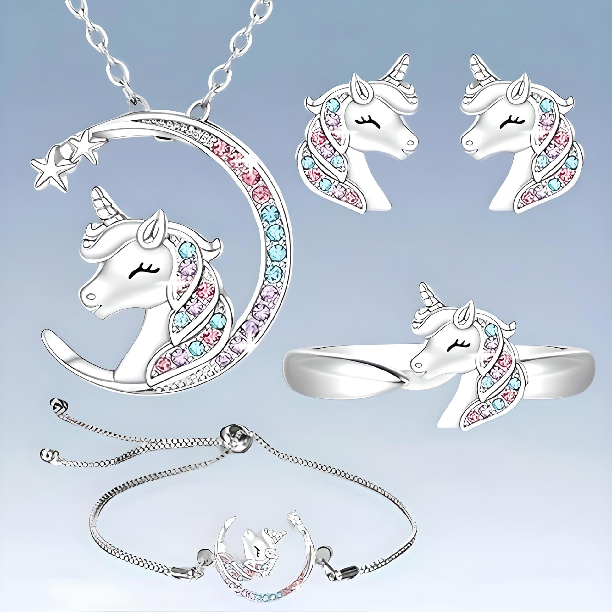 - COMPLETE SET: Includes a crescent moon necklace with unicorn pendant, matching stud earrings, adjustable bracelet, and ring - all adorned with pastel crystals