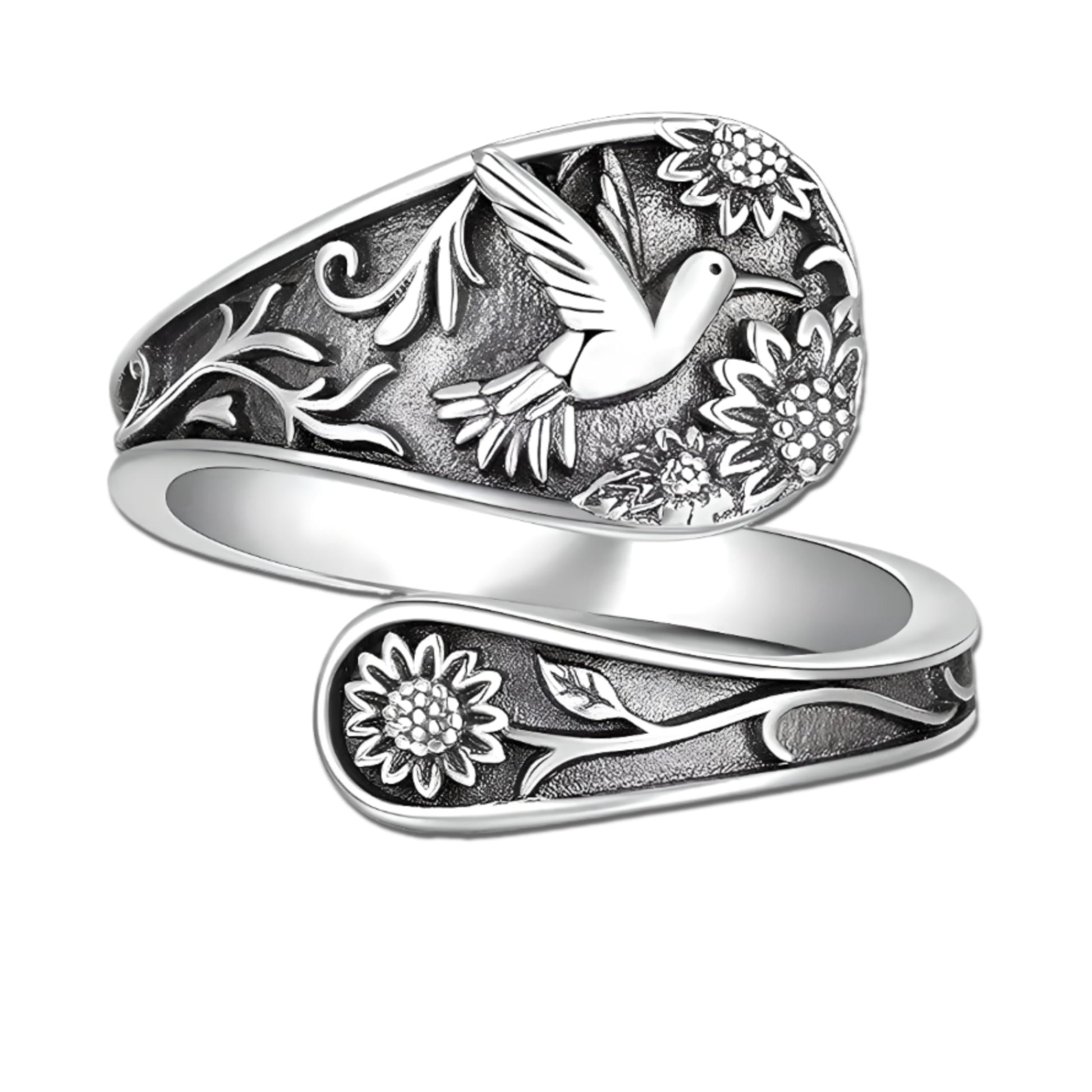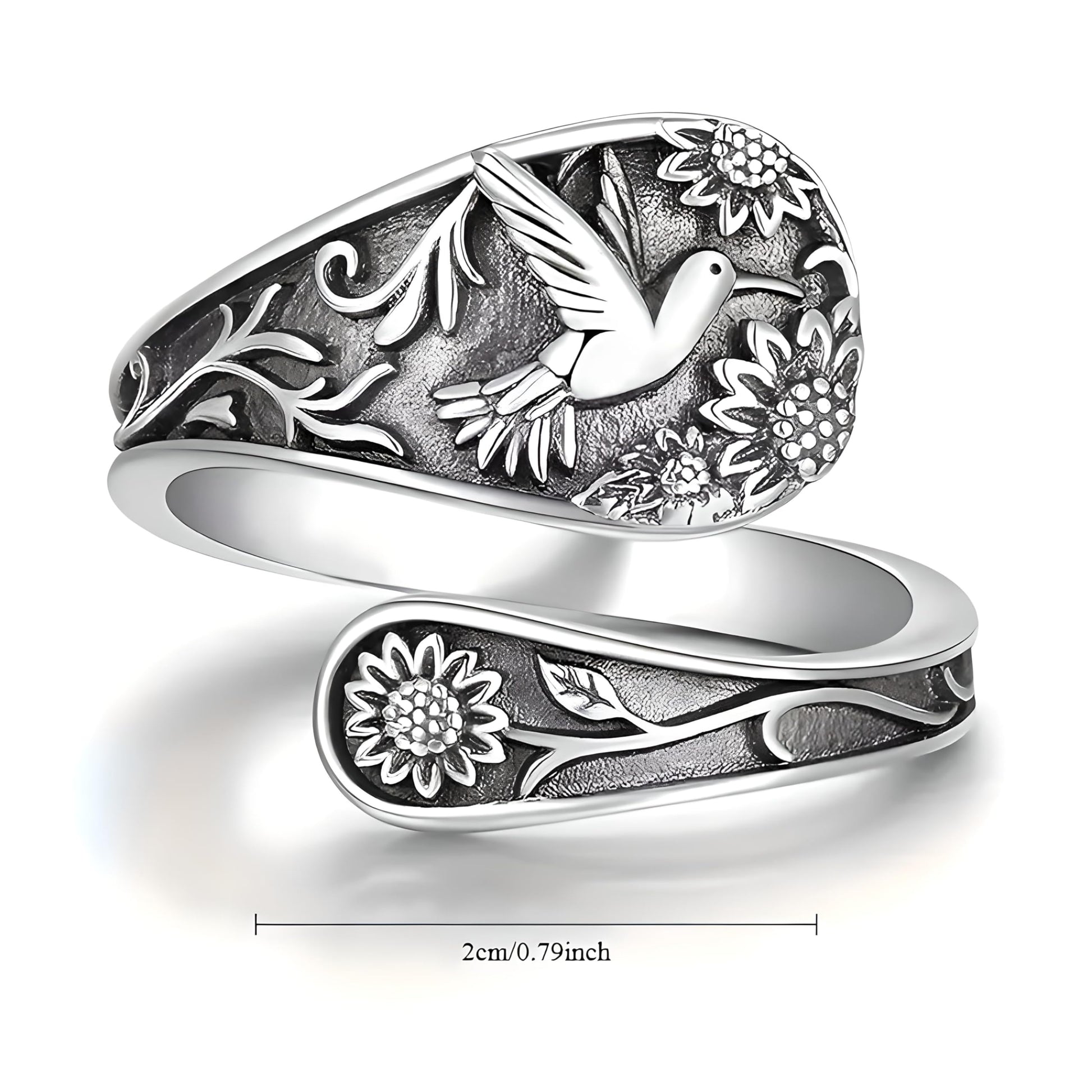 - DESIGN FEATURES: Vintage-inspired spoon ring featuring an intricate hummingbird motif surrounded by detailed floral and vine patterns in oxidized sterling silver