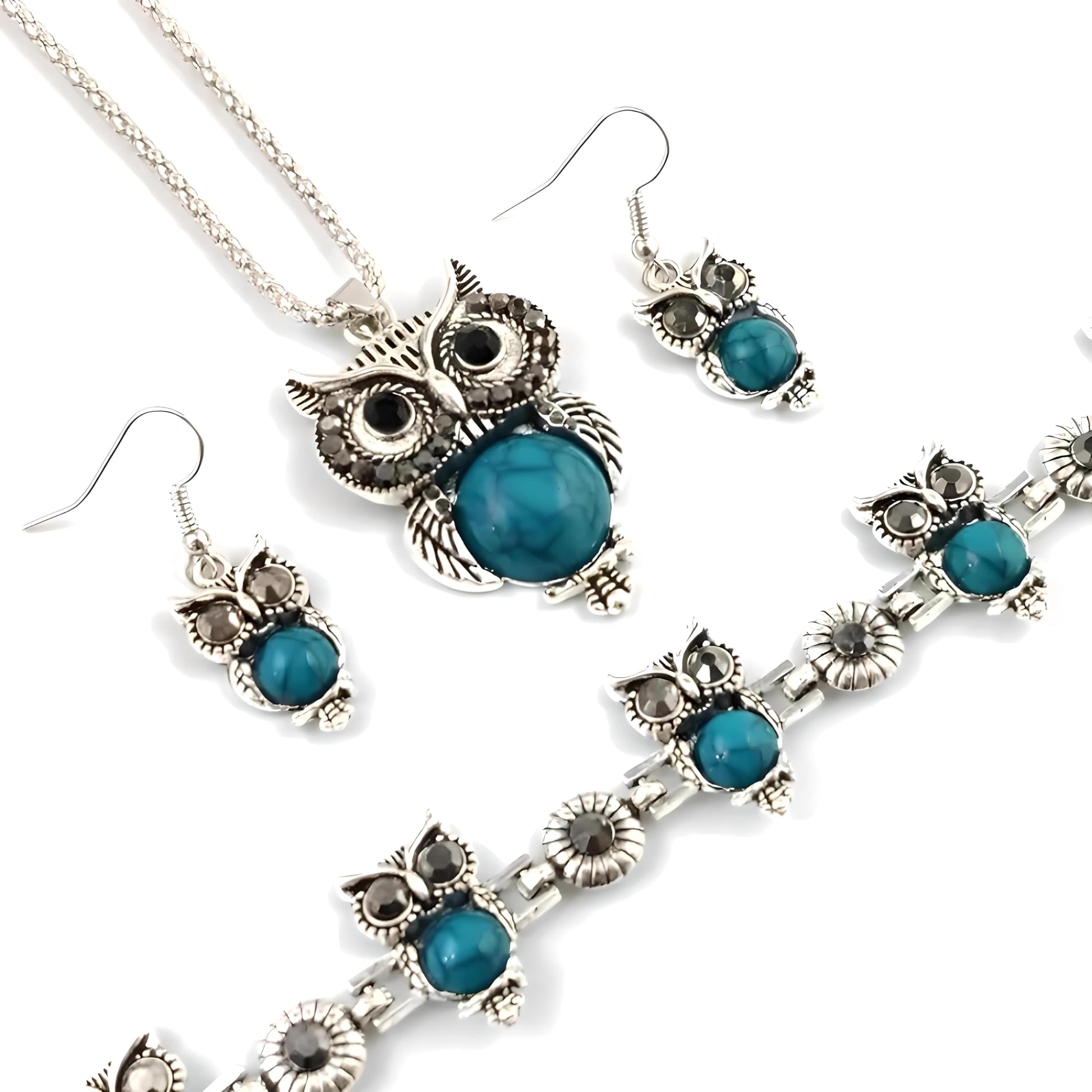 - ELEGANT DESIGN: Beautifully crafted silver-tone owl motif featuring turquoise-colored stone accents and intricate detailing throughout the set
